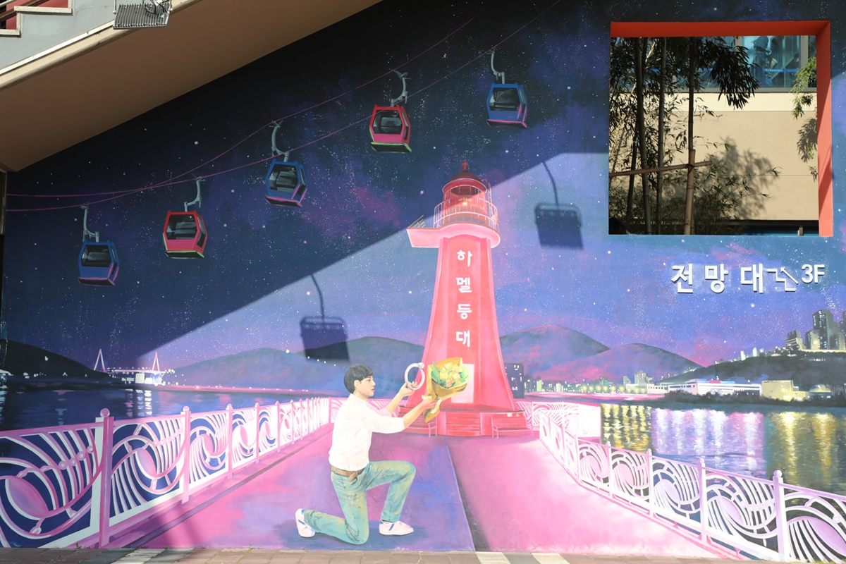 자산공원 매표소로 이동하는 벽면에 하멜등대를 배경으로 여성들이 많이 포즈를 취하며 사진을 찍는다.