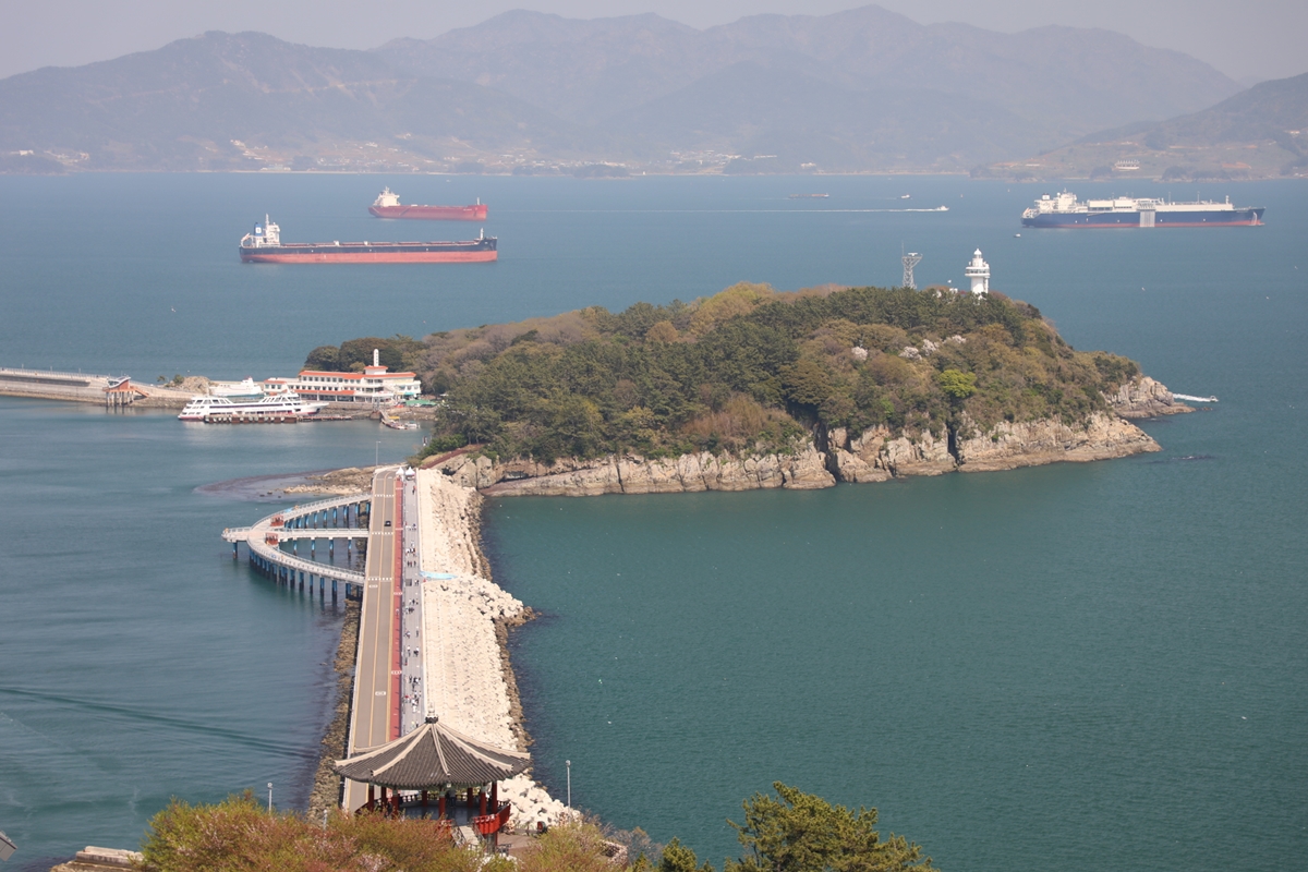 자산공원은 평지형 산정으로 여수 돌산과 연결된 1.5km 구간의 국내 첫 해상 케이블카를 놓았다.