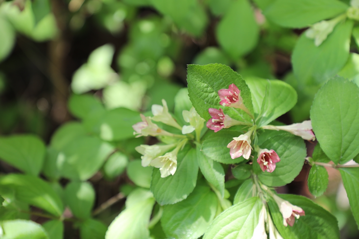 한 가지에 서로 다른 색의 병꽃이 피었다.