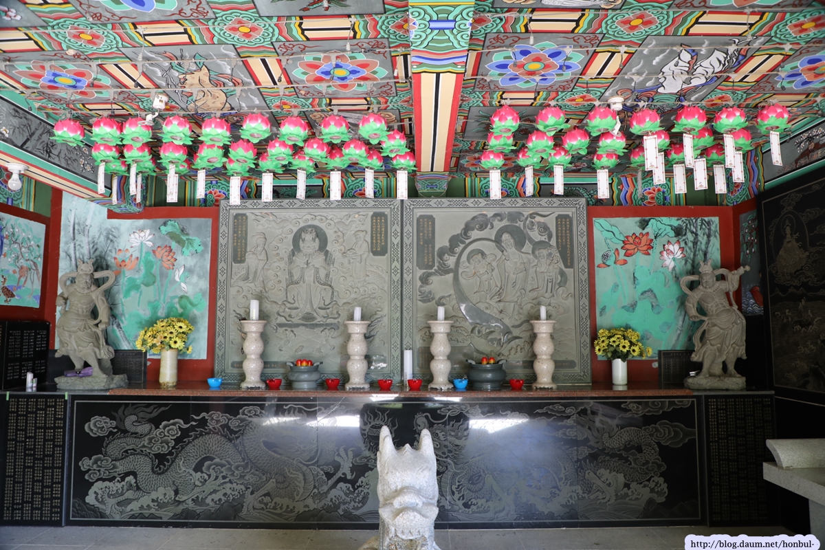 대웅전 축대의 여기저기에 거북과 용, 그리고 꽃게 모양을 곁들인 대웅전은 흔히 '반야수용선'이라 불린다.