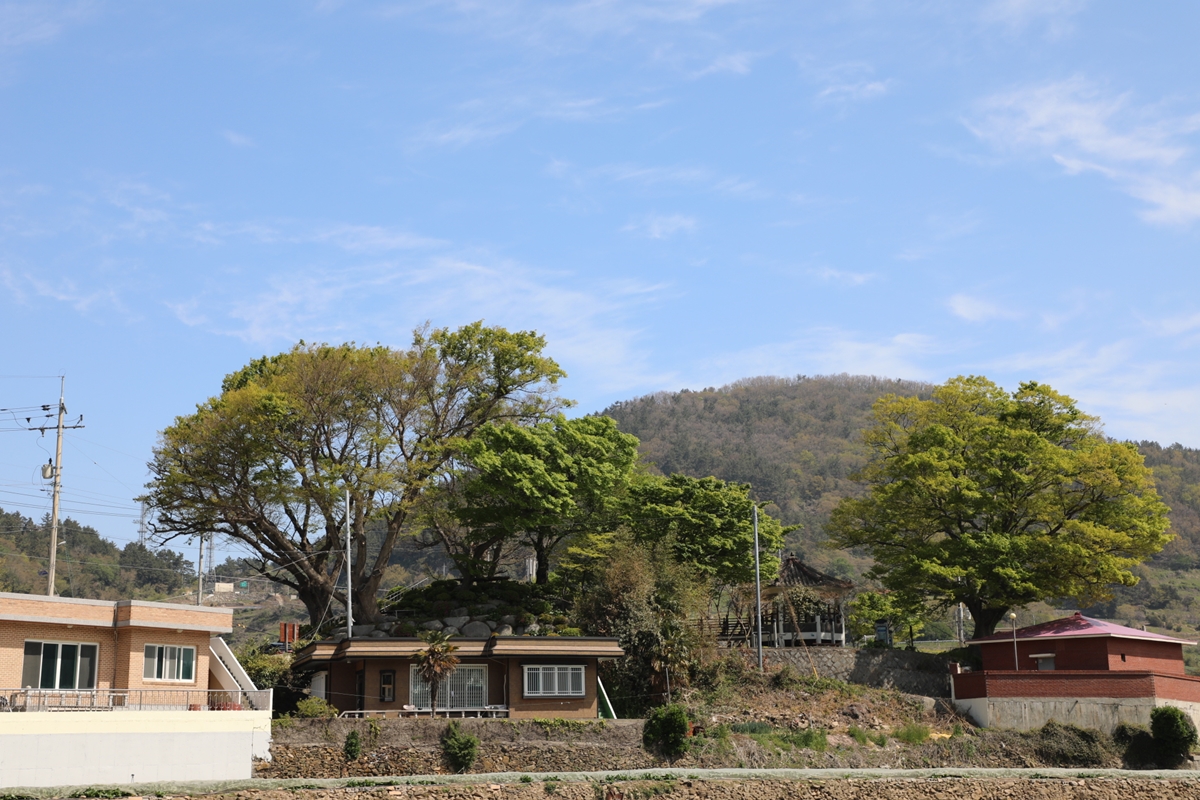 왼쪽이 보호수로 지정된 느티나무이고, 오른쪽 나무가 죽포 보건진료소 뒤에 있는 느티나무다.