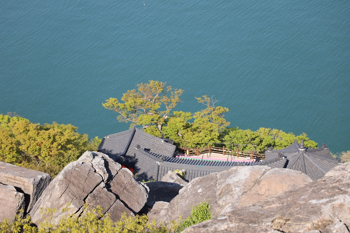 향일암 위 금오봉에 오르면 시원한 남해 바다를 헤엄치는 육지에서 바다로 향하는 거북이형상을 볼 수 있다.