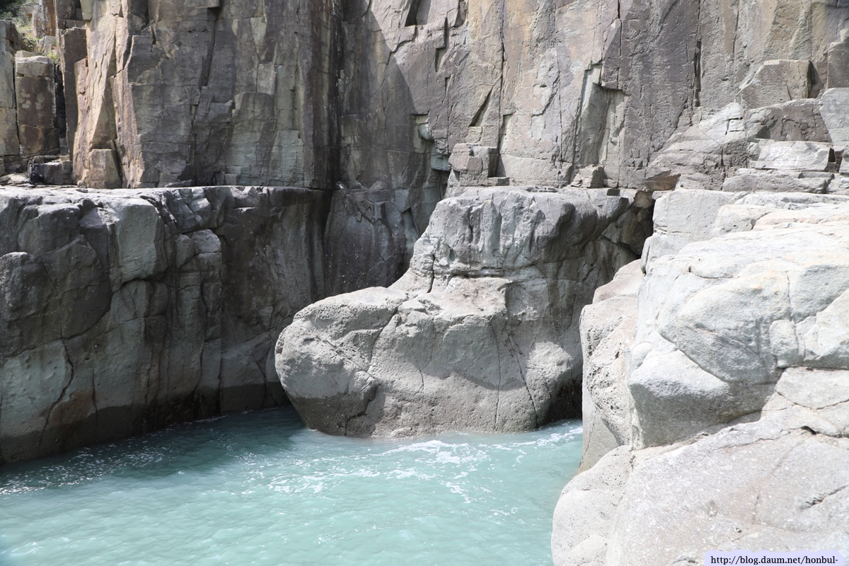 물길이 왼쪽과 오른쪽 쌍용굴로 들어가며 벽을 치는 소리가 요란하게 난다.