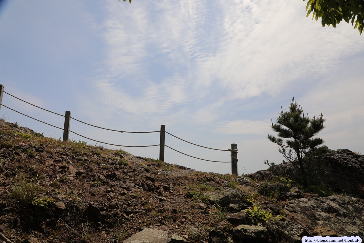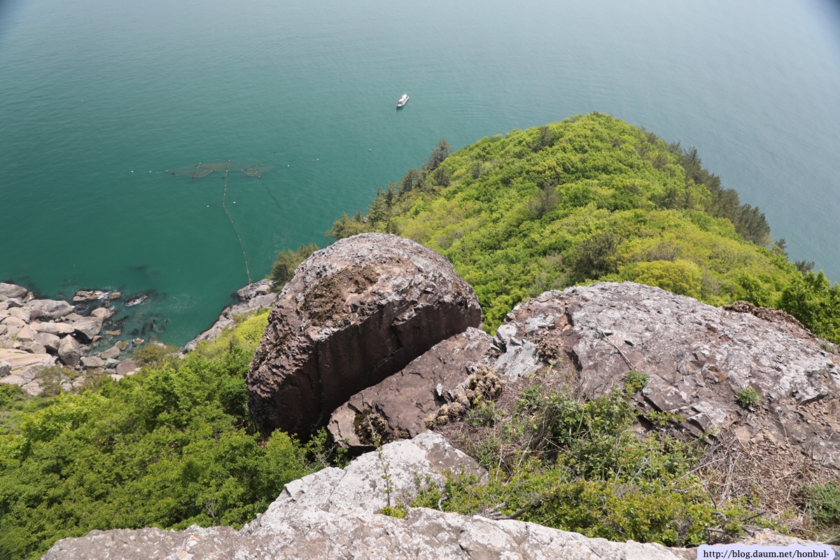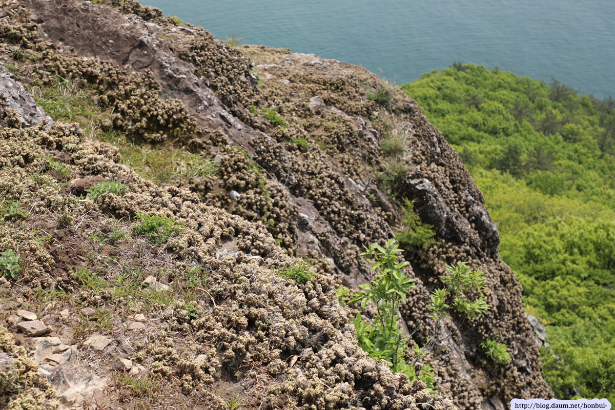 올라갈 땐 거의 사용하지 않는 바닷가 길인데, 정상 등산로와 만나니 금줄이 쳐진 곳이다.