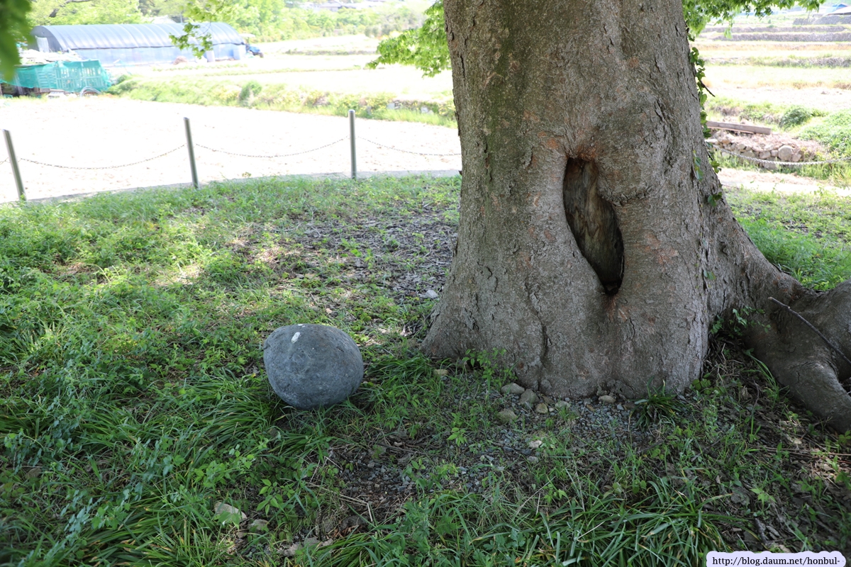 마을 느티나무 아래 제법 큰 둥근돌을 놓았다.