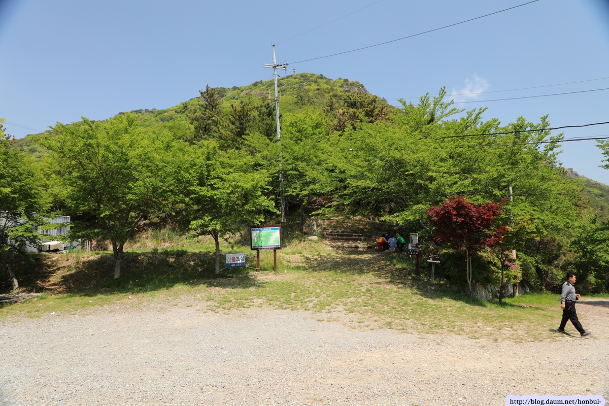 도로를 건너며 잠시 후 오르게 될 영취산 시루봉을 본다.