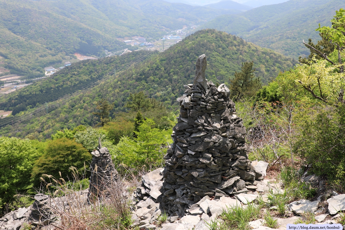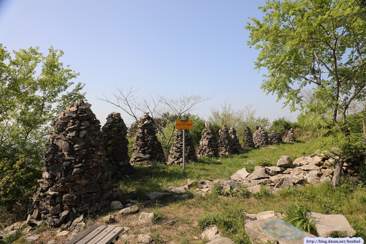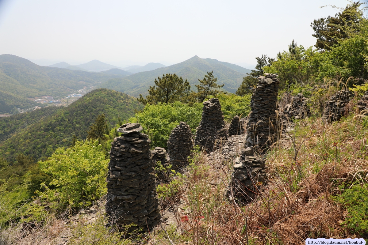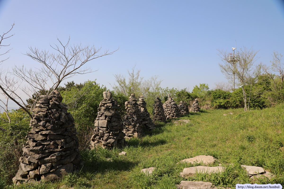 정상엔 봉수대는 아니되 커다란 원통형 돌탑이 전망대 역할을 하고, 아래쪽에 12개 원추형 돌탑이 있다.