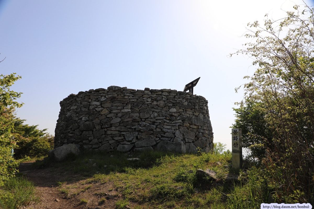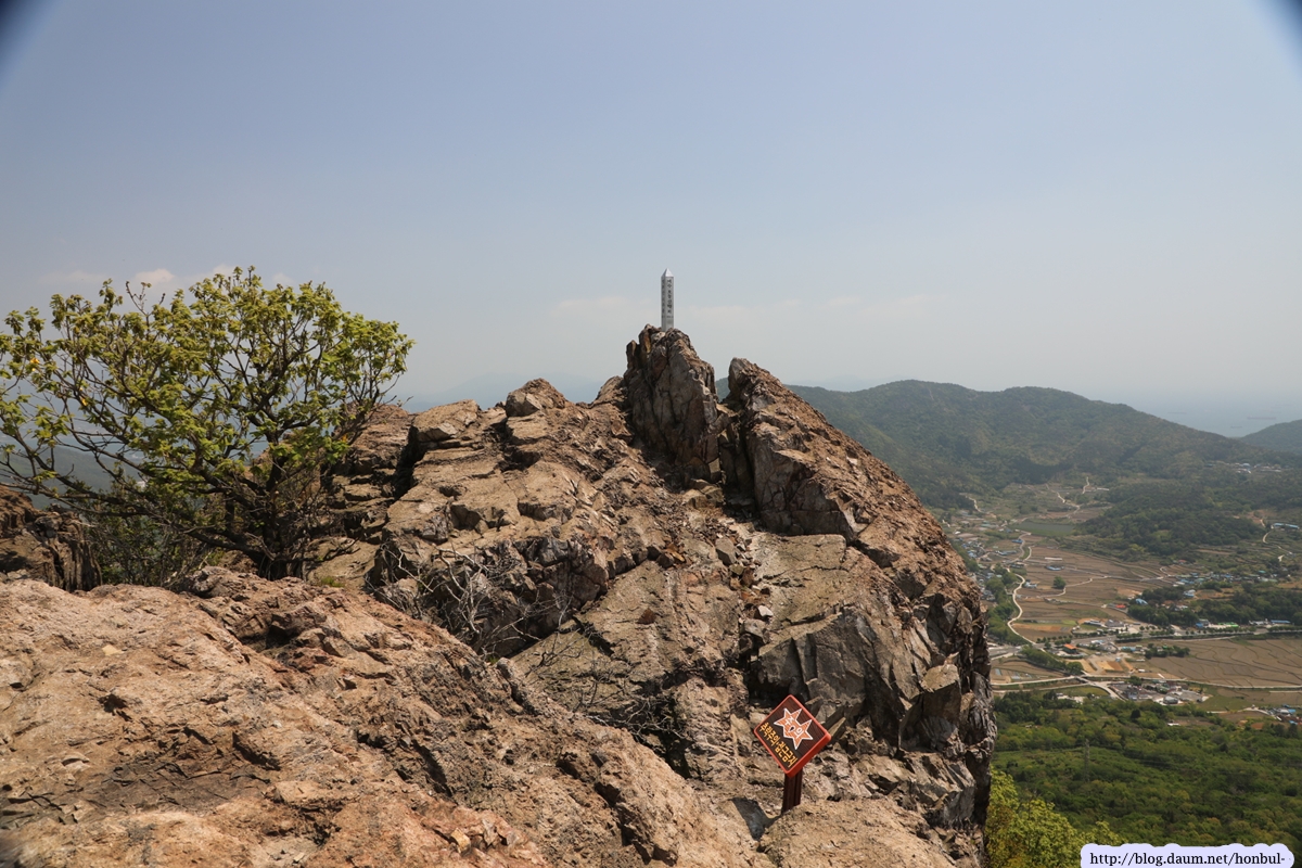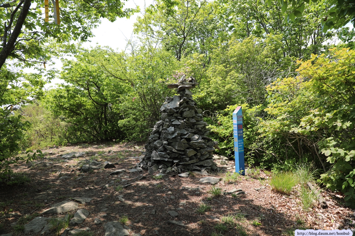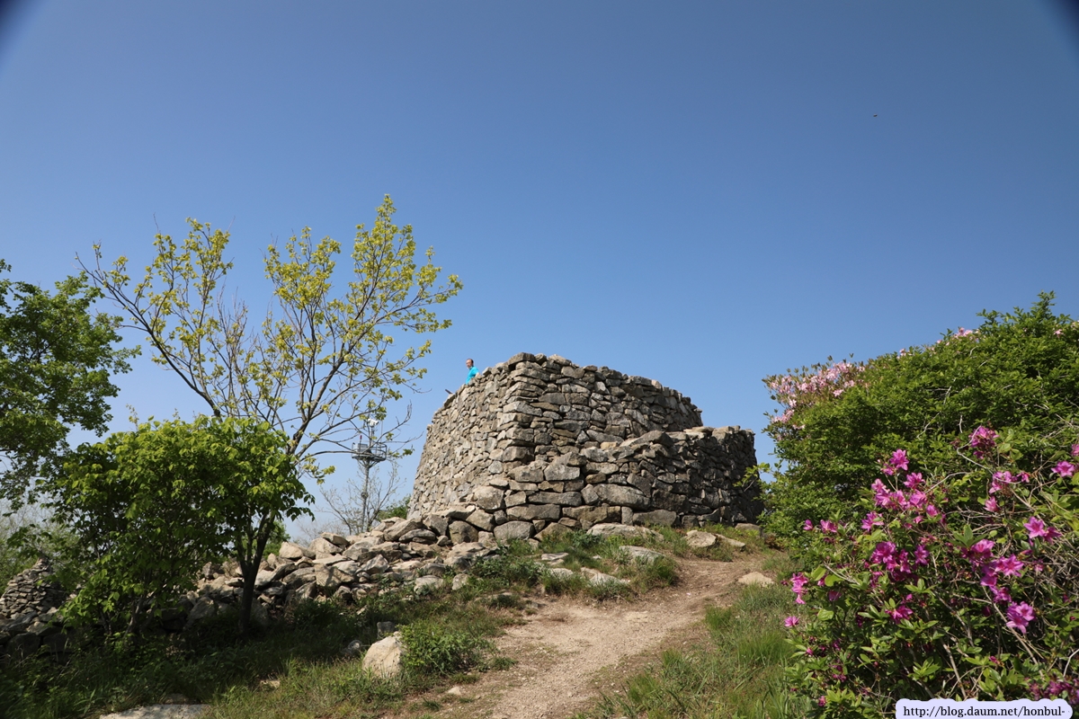 정상엔 봉수대는 아니되 커다란 원통형 돌탑이 전망대 역할을 하고, 아래쪽에 12개 원추형 돌탑이 있다.