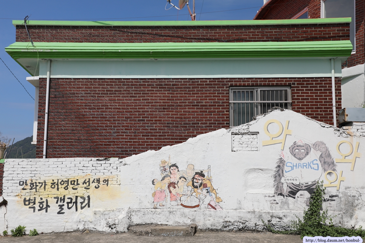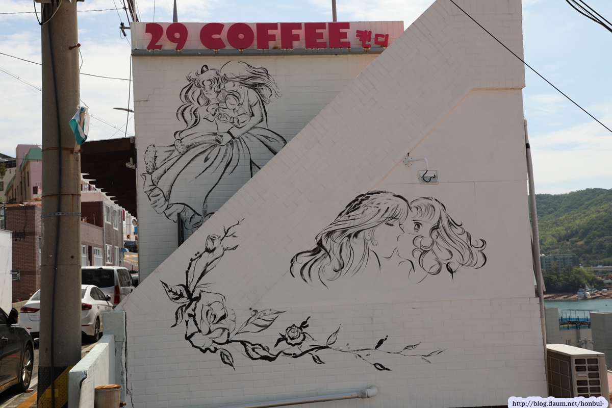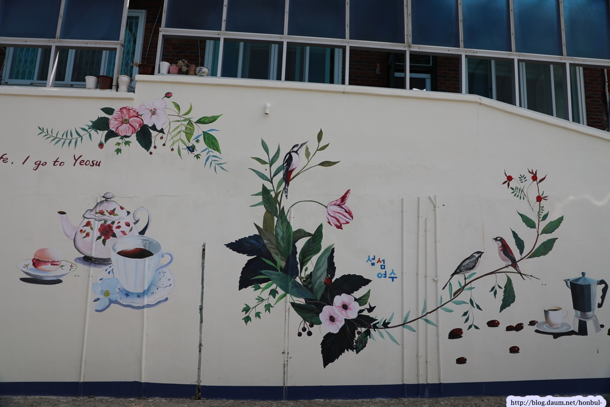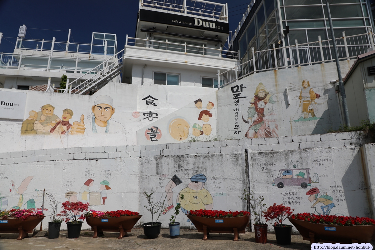 벽화마을 상점도 벽에 벽화를 넣어 광고 효과를 노린다.