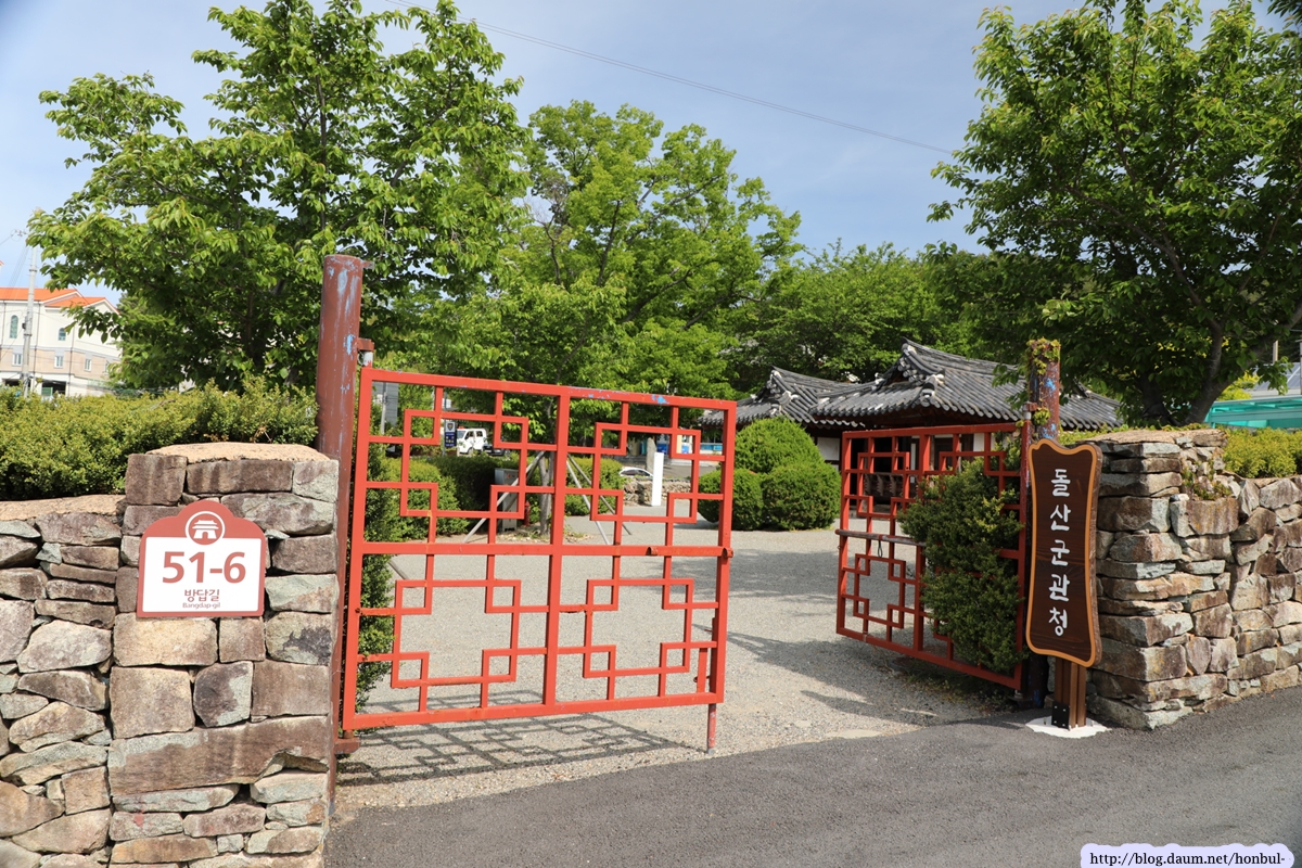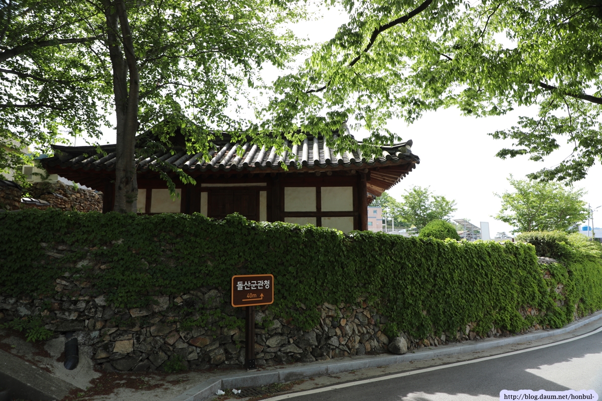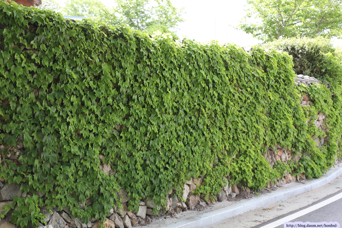 돌산군 관청의 돌담길은 담쟁이 풀이 파랗게 덮고 있다.