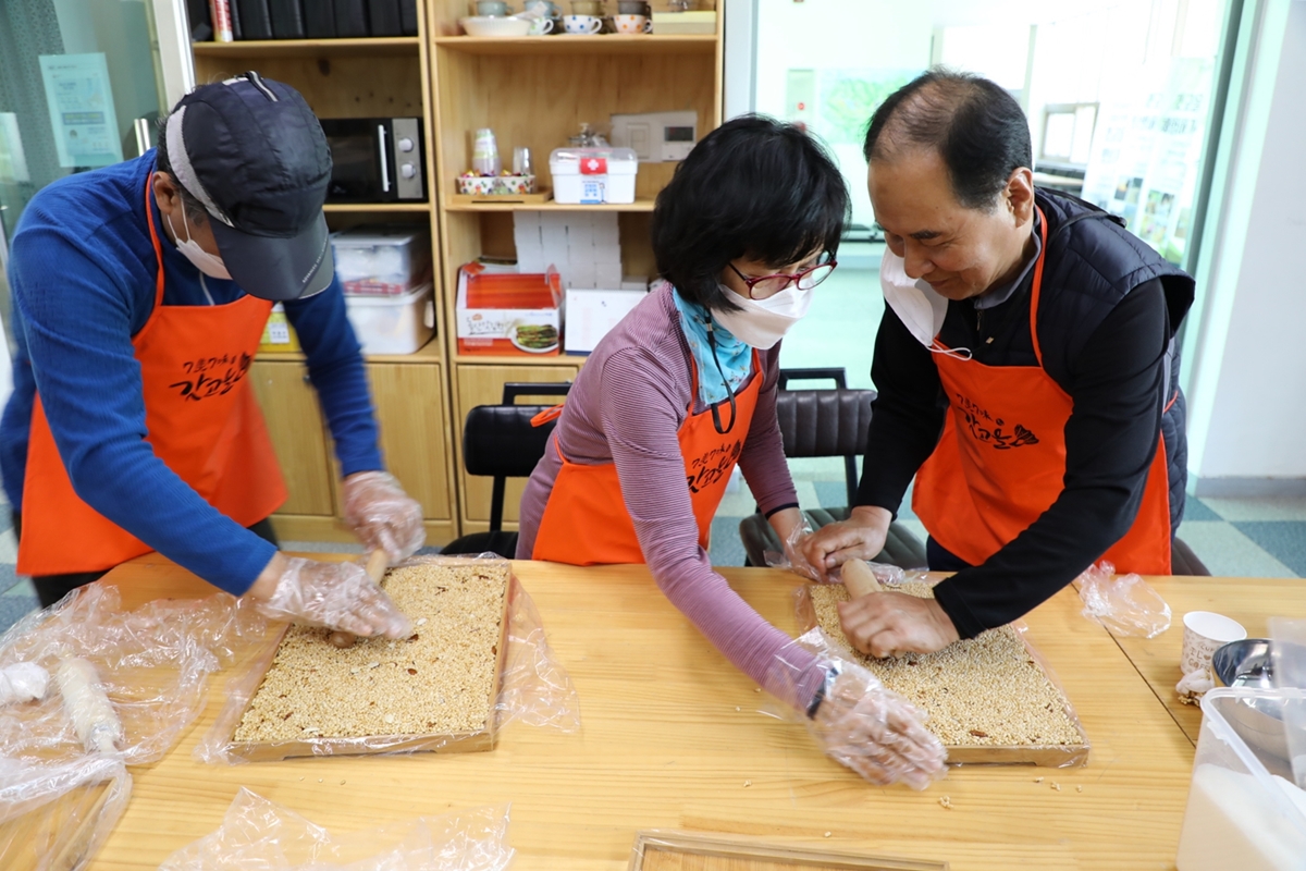 나중 틀에 넣고 압력을 가해 밀대로 굴리며 수평을 맞추면 점차 모양이 잡히며 강정 틀이 생긴다.