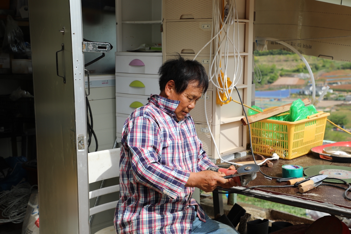 주인아저씨가 갓을 채취할 칼을 그라인더에 가신다.