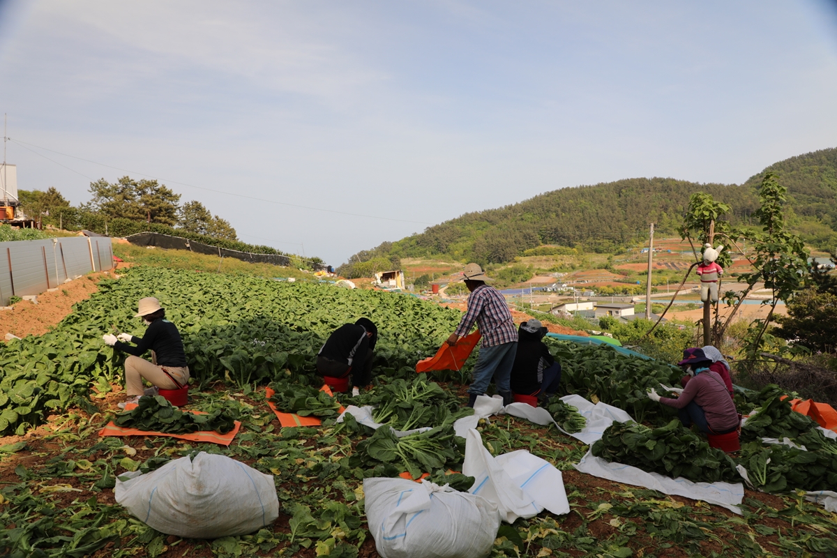 20kg를 담을 정도의 큰 보자기 13개 분량의 갓을 수확하면 하루에 돌산 갓김치를 만들 분량이다.