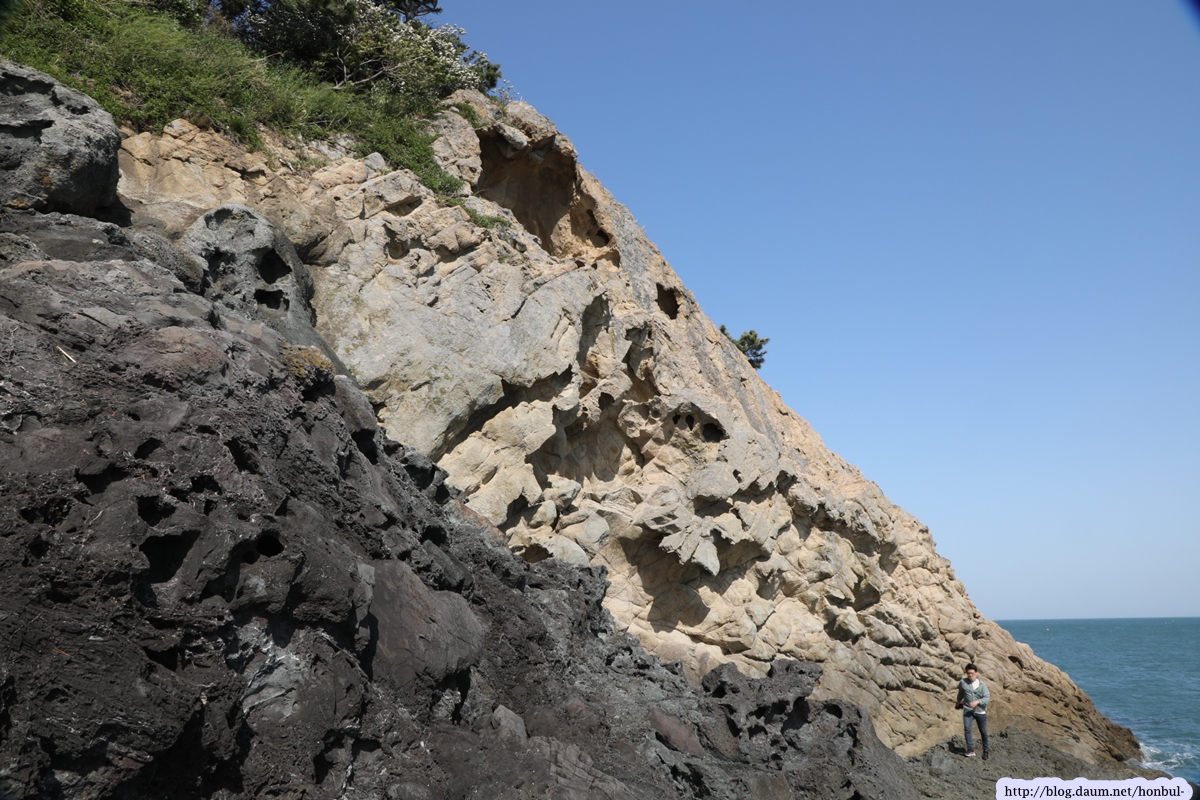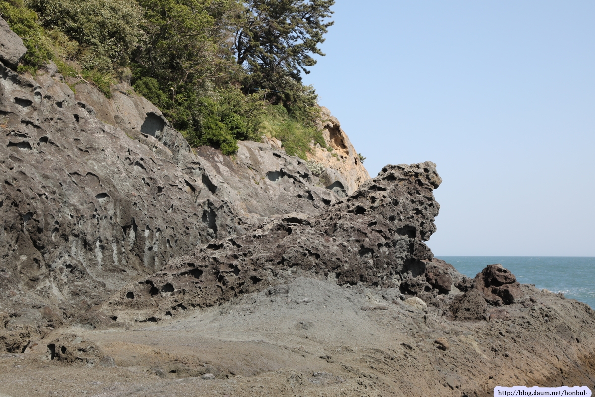 안쪽으로 들어오면 현무암질의 검은 바위가 아니라 황토색의 특별한 바위를 만난다.