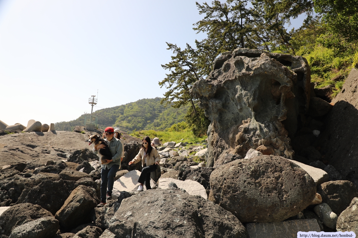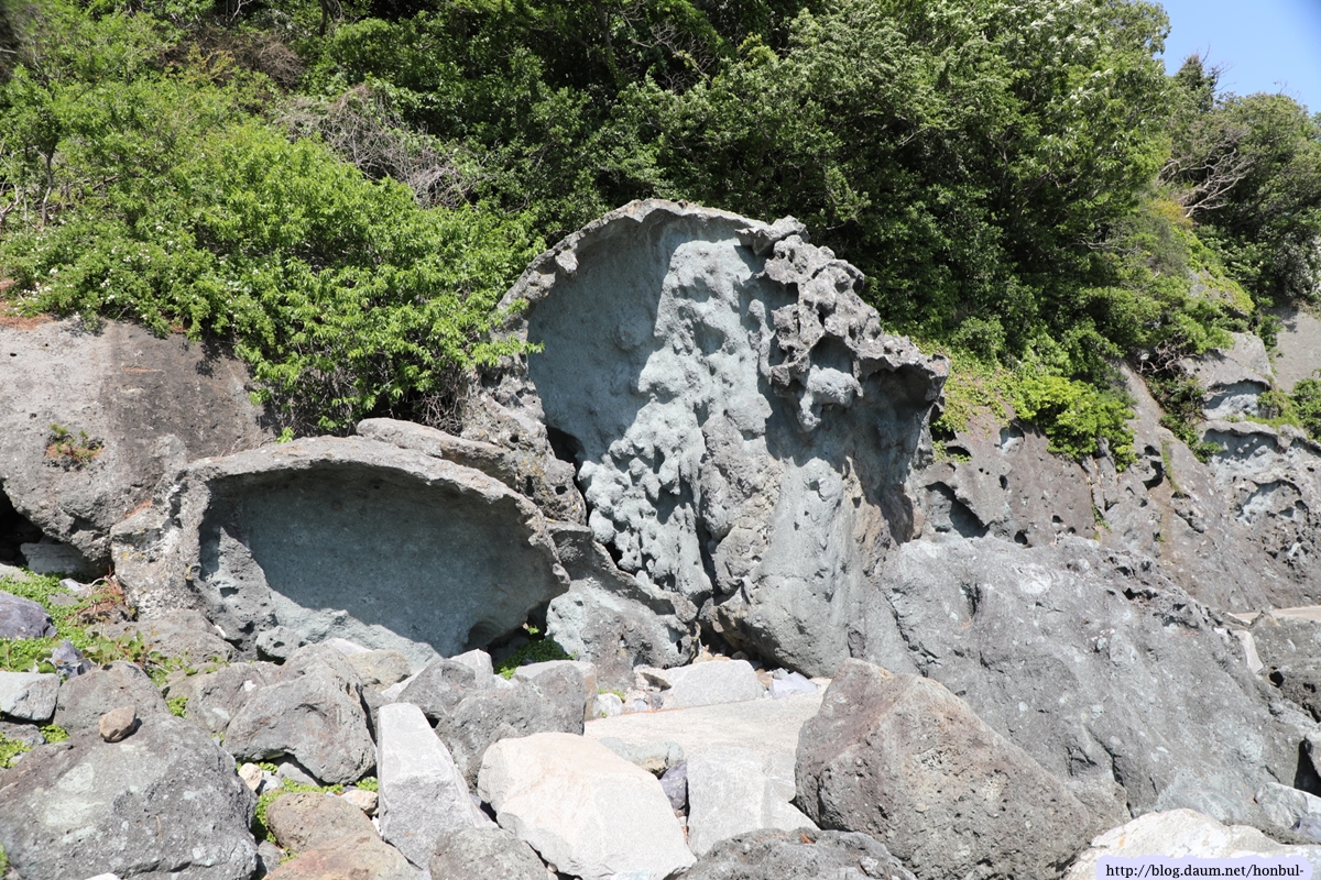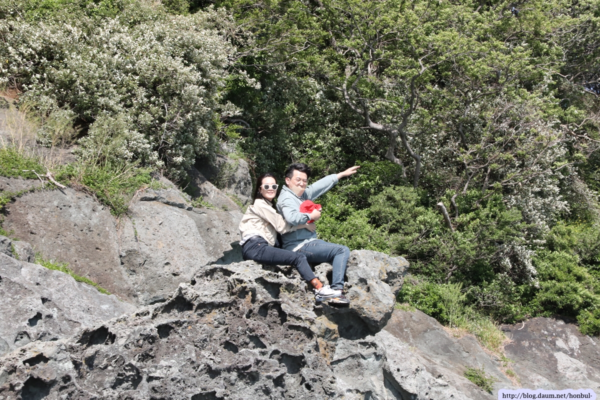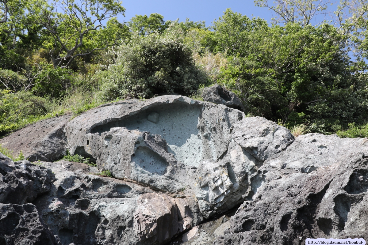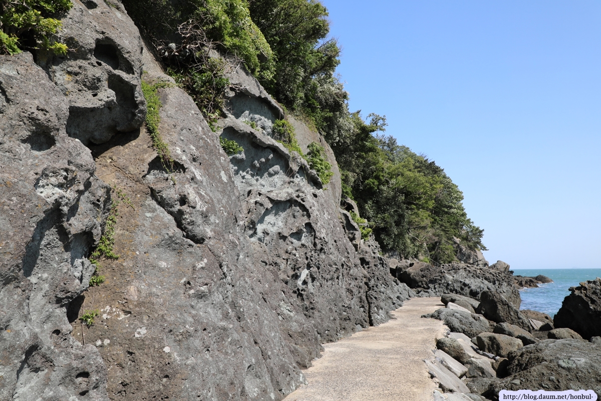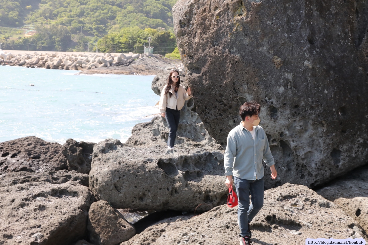 즐풍은 아는 성두마을의 이 해안은 사람이 다니지 않아 원시상태의 꺼끌꺼끌한 표면을 그대로 갖고 있다.
