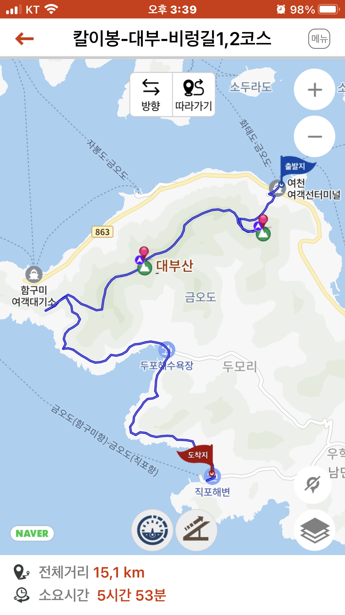 주말을 앞둔 오늘 금오도로 들어가 대부산을 타고 시간이 되면 금오도 비렁길 1, 2코스를 탈 생각이다.