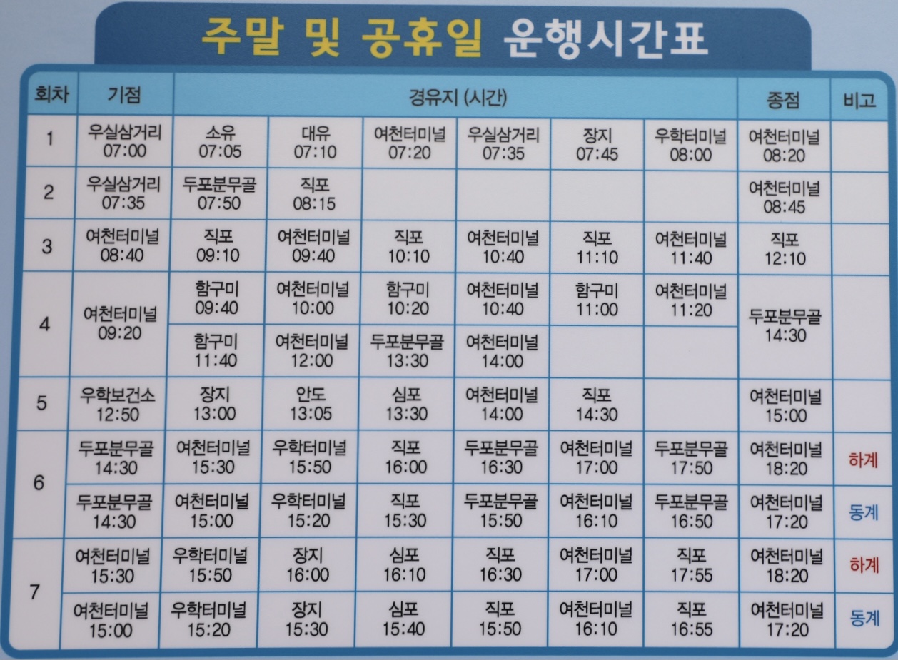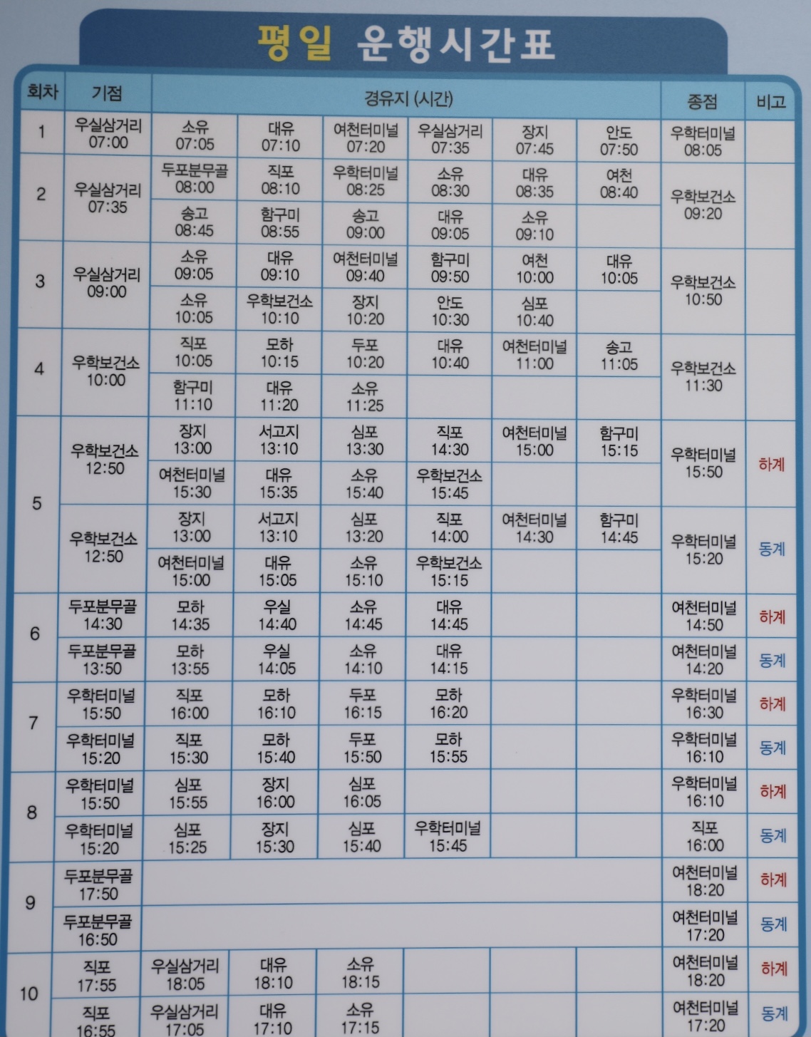 직포뿐만 아니라 각 지역의 버스시간표이다.