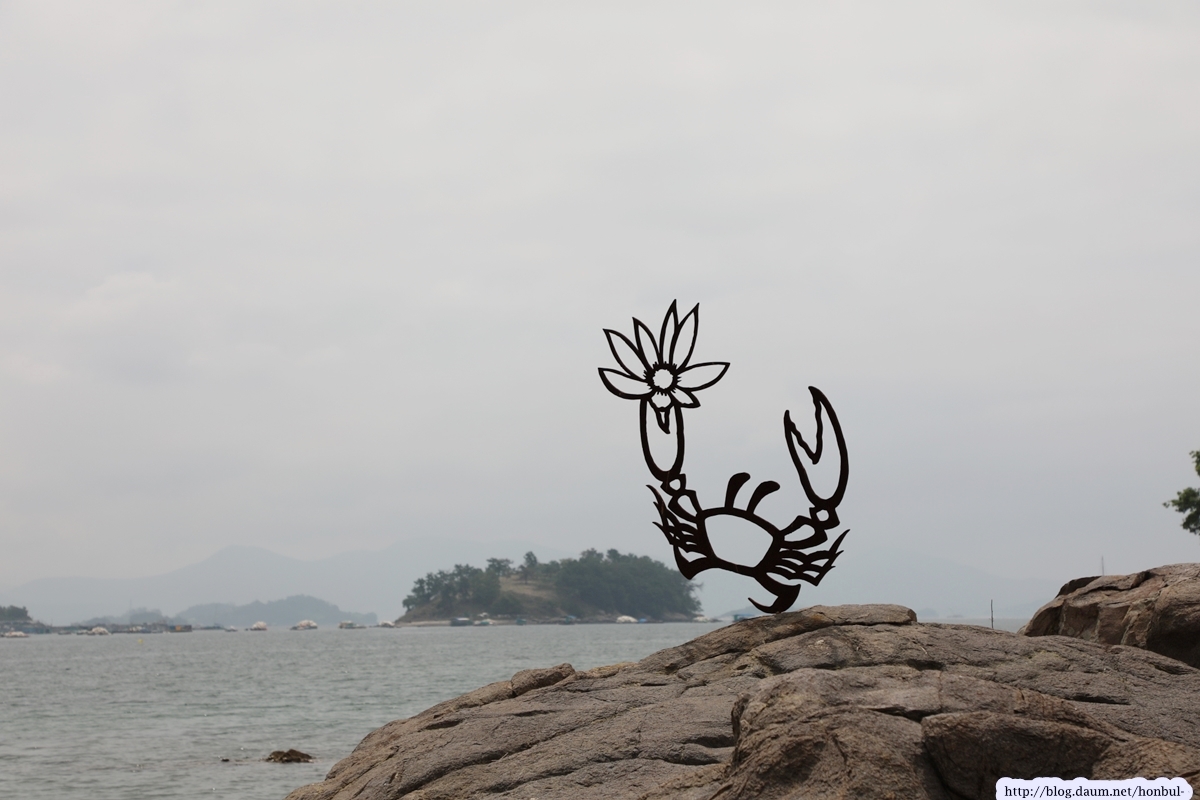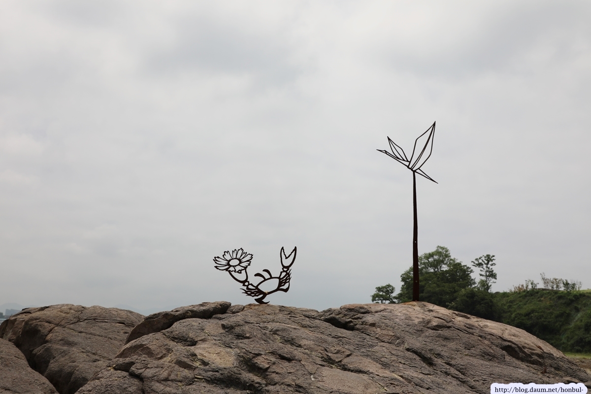 진섬다리를 건너며 바다 위 바위에 설치된 조형물이 반갑게 맞는다.