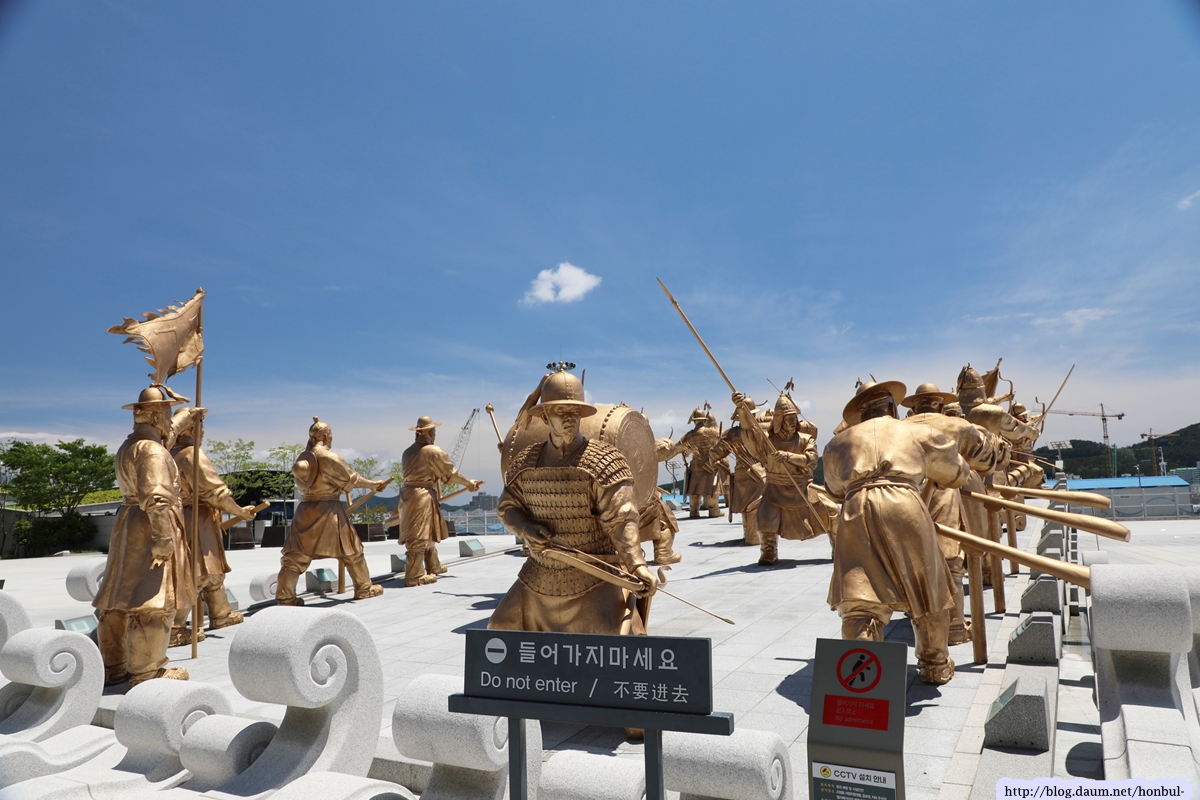 임진왜란 당시 한산대첩 전투 장면을 판옥선 위에 재구성한 수군 군상 조형물이다.