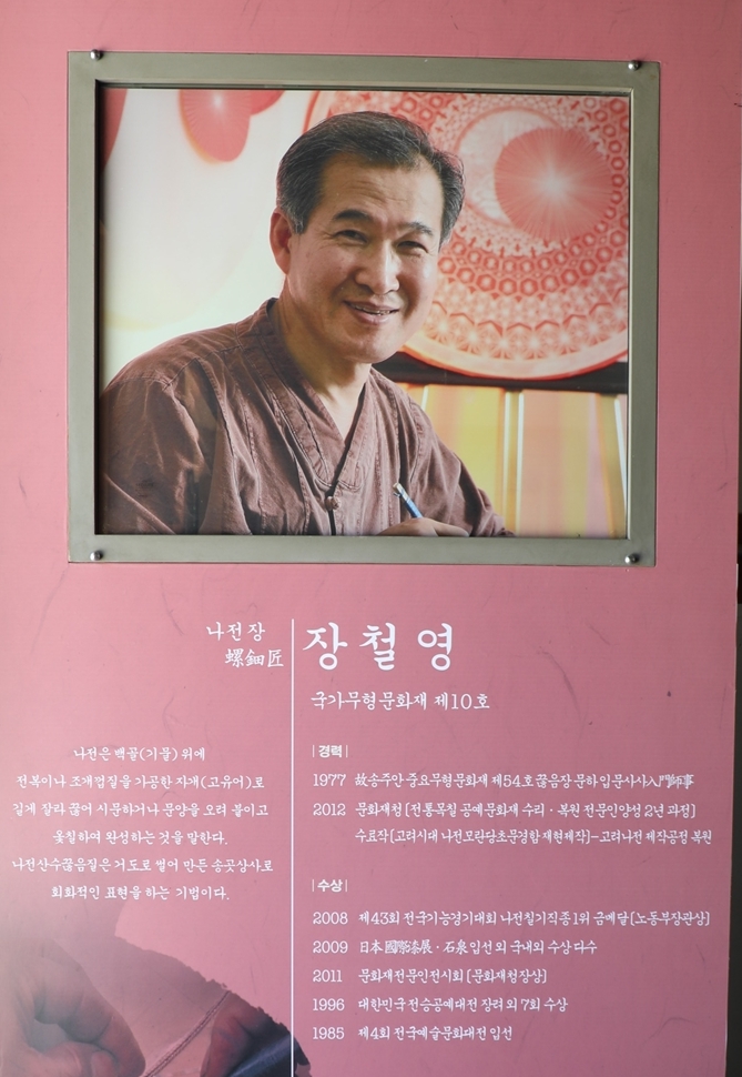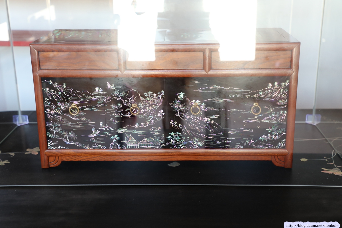 그다음에는 나전(전복껍데기)을 붙이고, 상칠방에 가서 다시 옻칠을 하고, 두석방에 가서 장석을 단다.