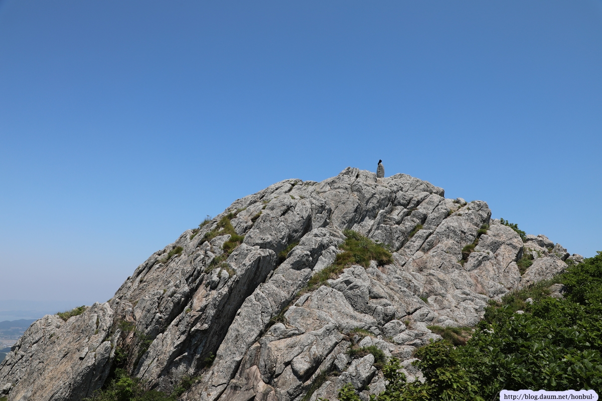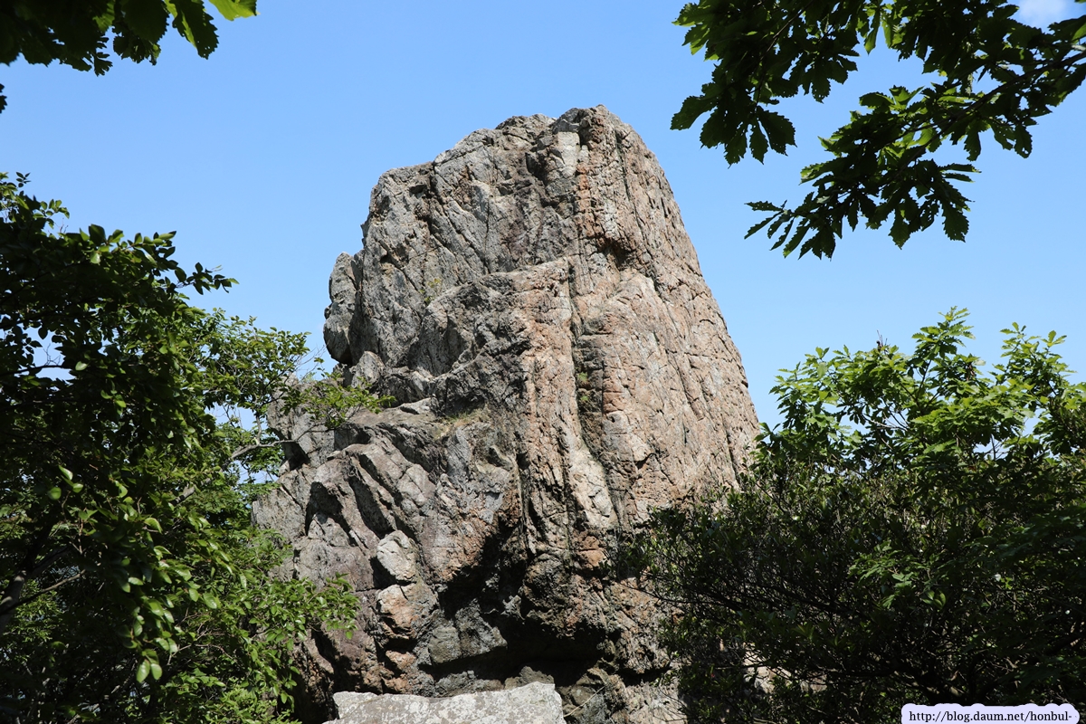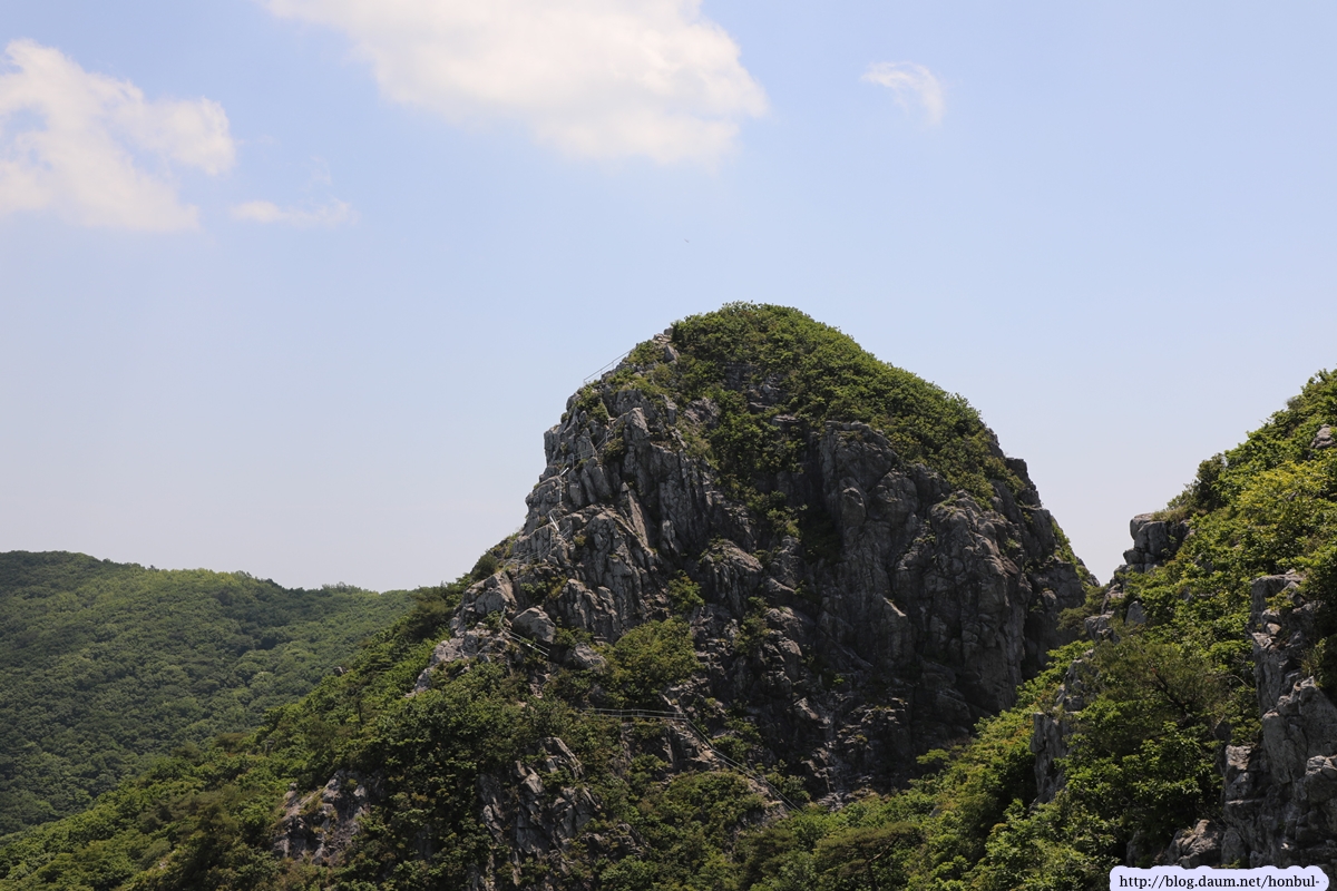 구름 가운데 우뚝 솟아 자태를 뽐내며 봉우리가 서있다. (안내글)