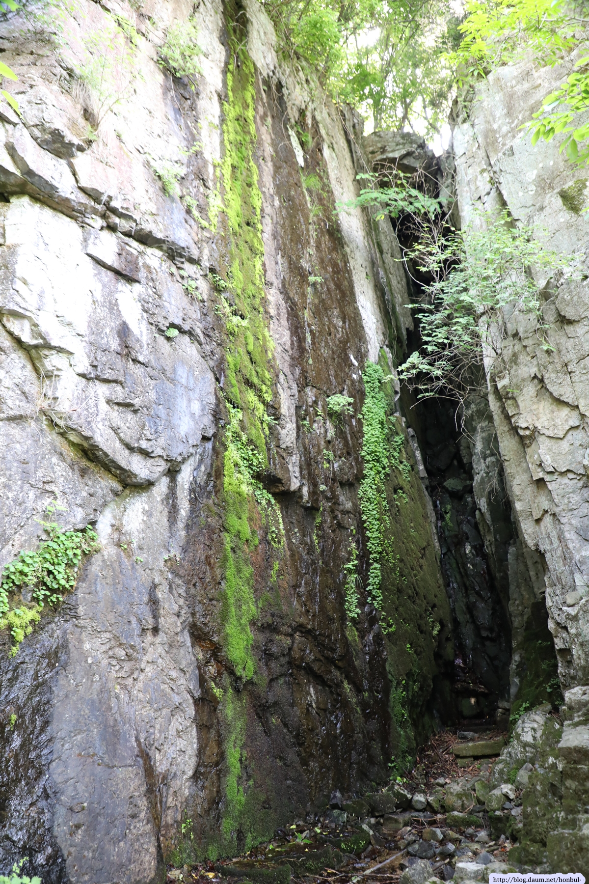 강산폭포는 물이 말라 폭포의 위용을 볼 수 없다.