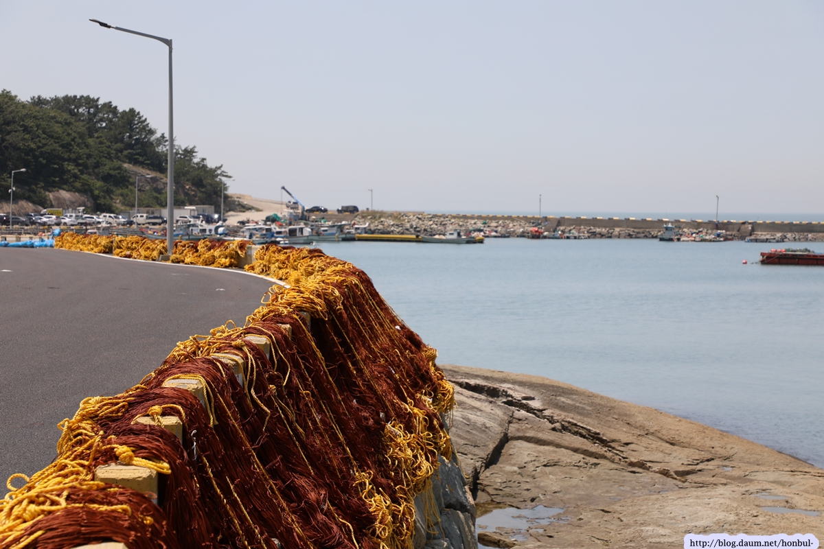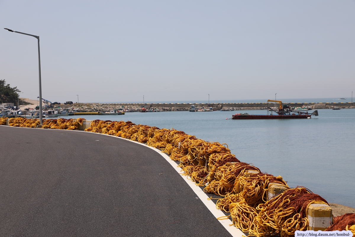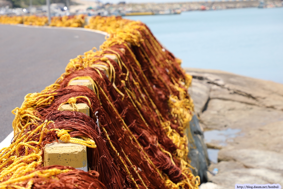 어느 포구 밖에 새로 산 그물을 도로변에 걸어 놓았다.