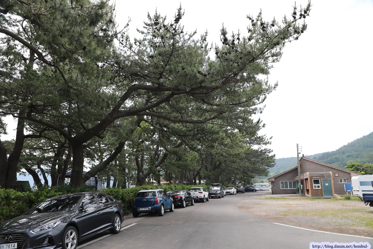 해수욕을 하고 나오면서 모래 사장을 지나 바로 커다란 곰솔이 햇볕을 가려준다.