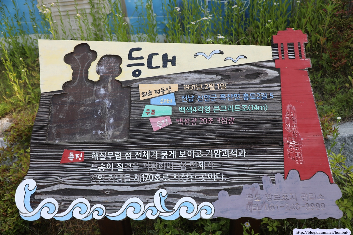 흰색띠를 두른 듯한 돌산 전경을 한눈에 바라볼 수 있는 곳에 위치한 등대이다.