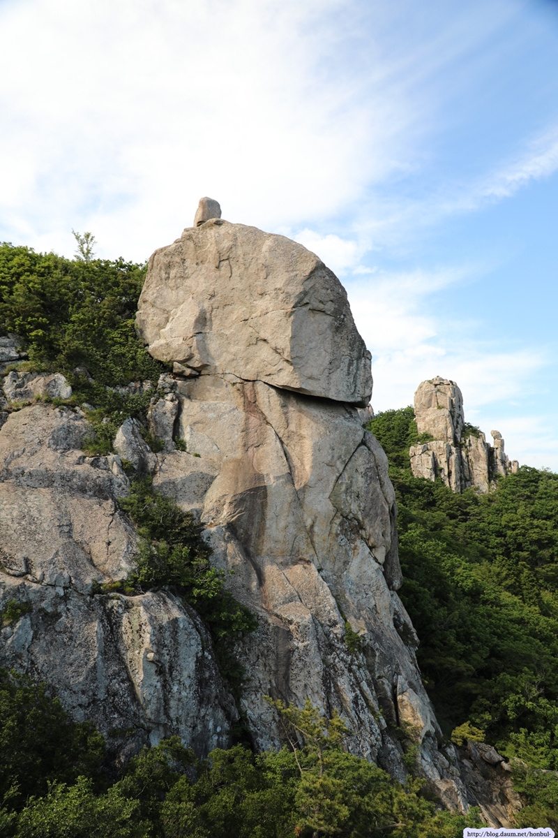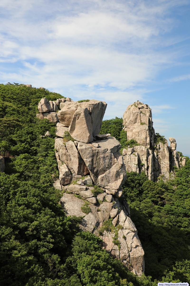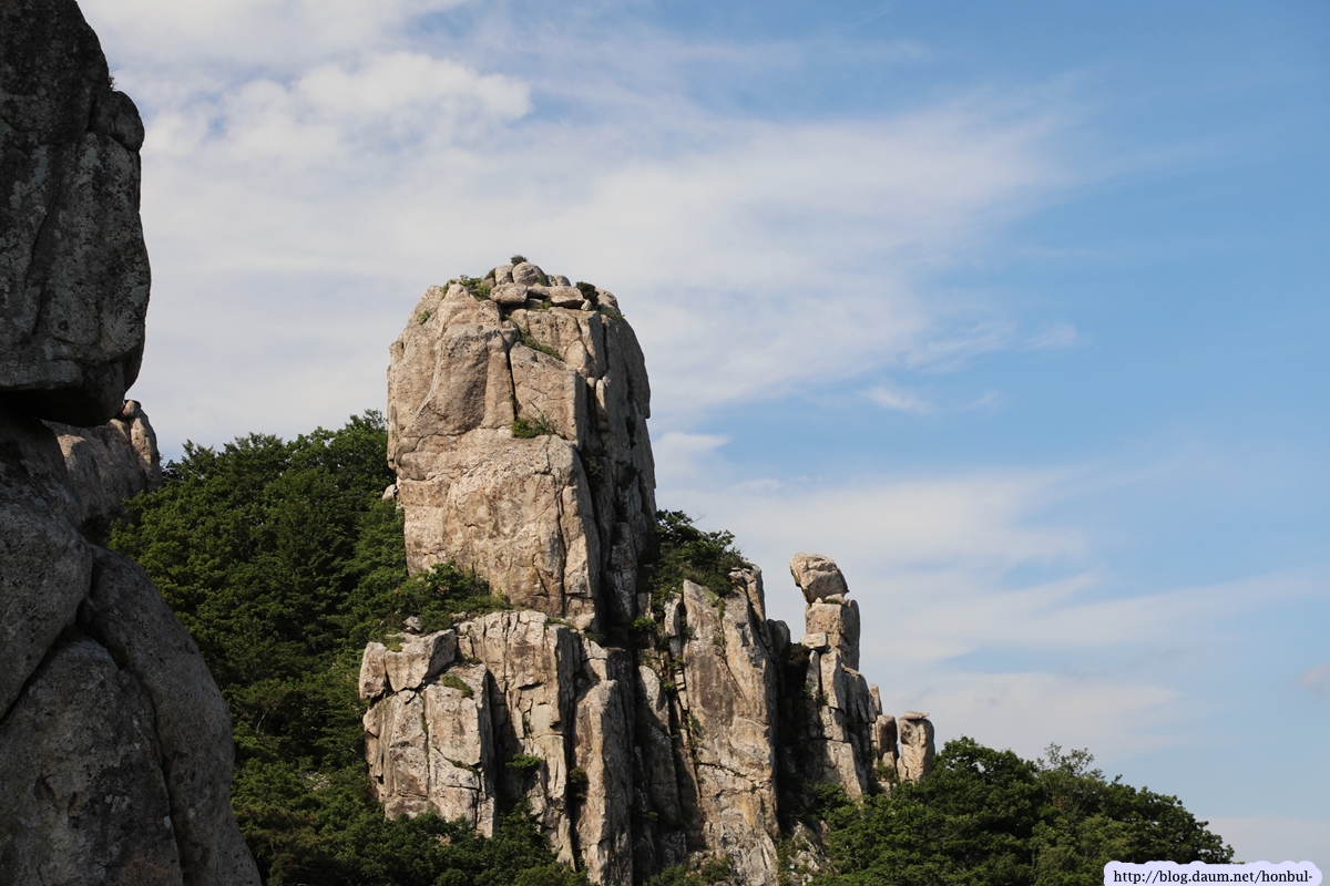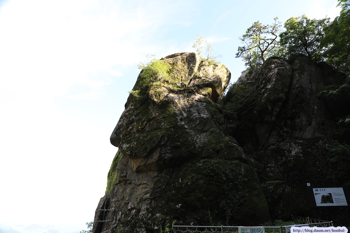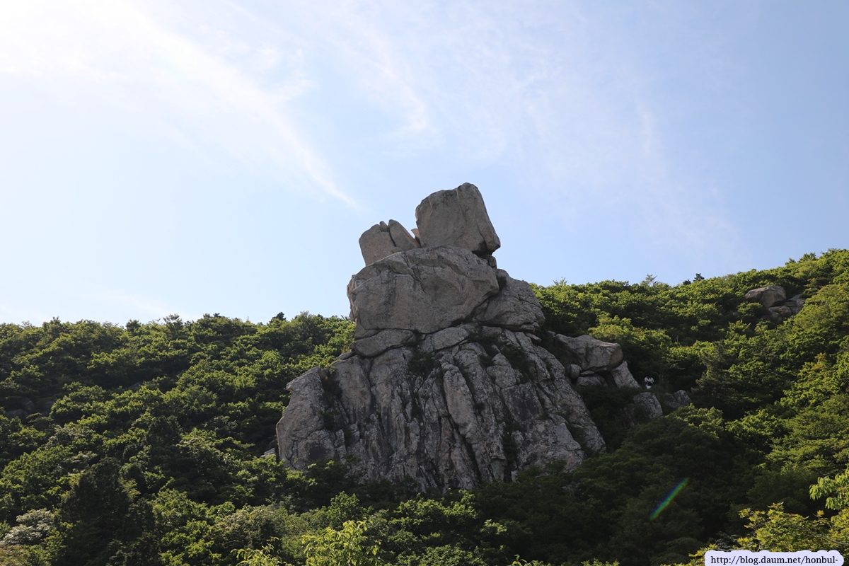 현 위치에서탐방로를 따라 5분 정도 내려가면 갑자기 탁 트이는 시야에 요새처럼 거대한 돌산이 우뚝 솟아 있다.