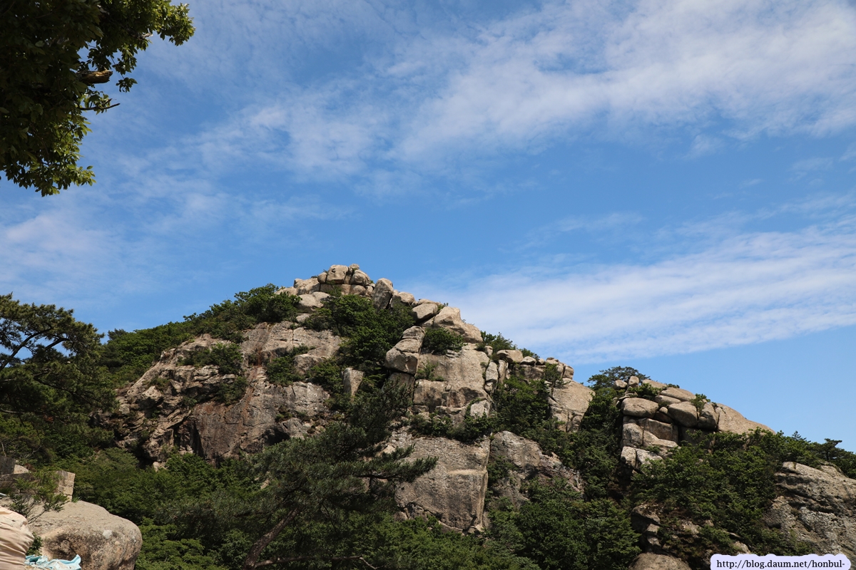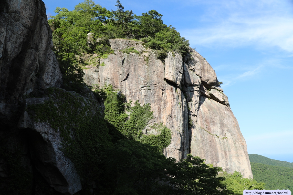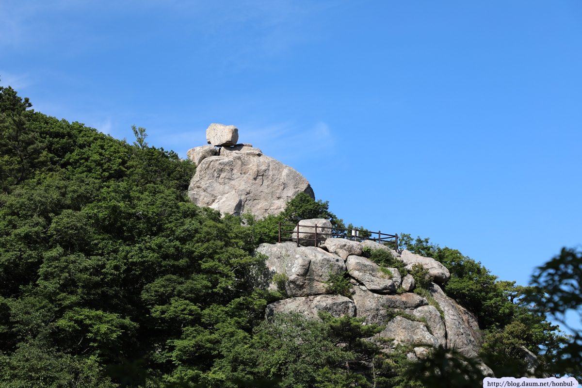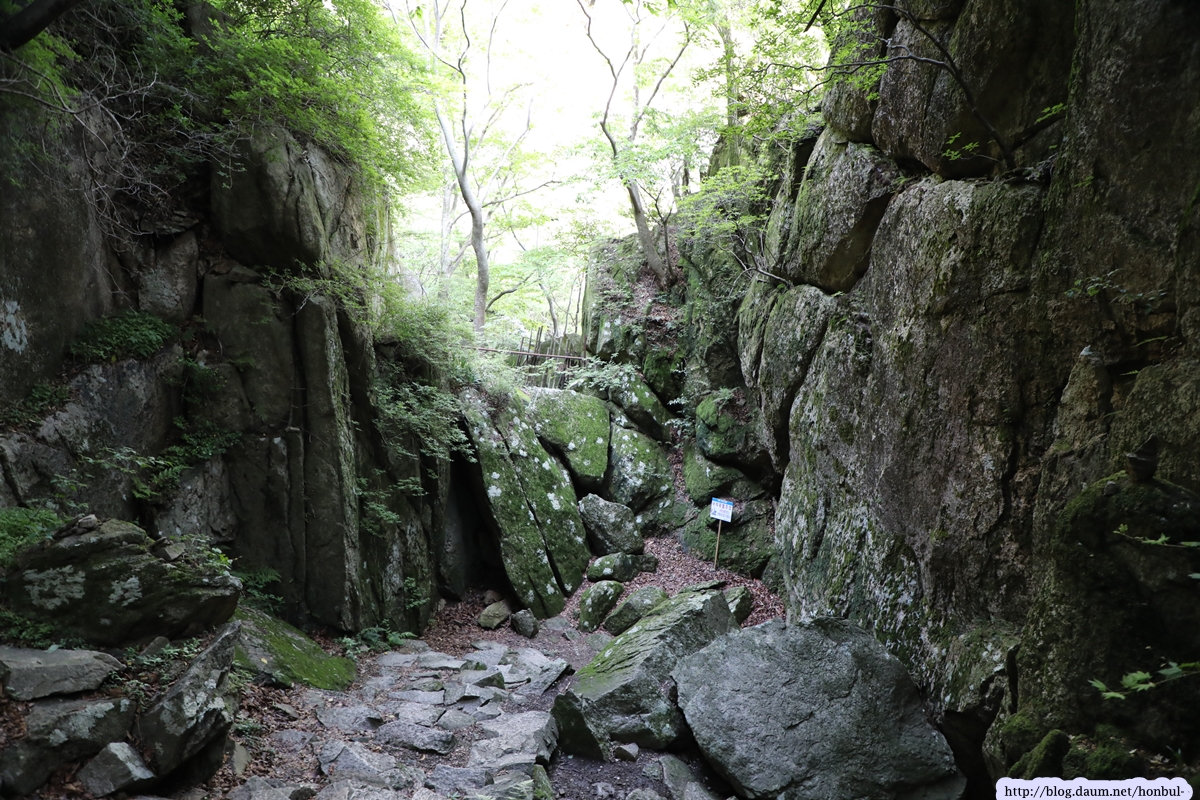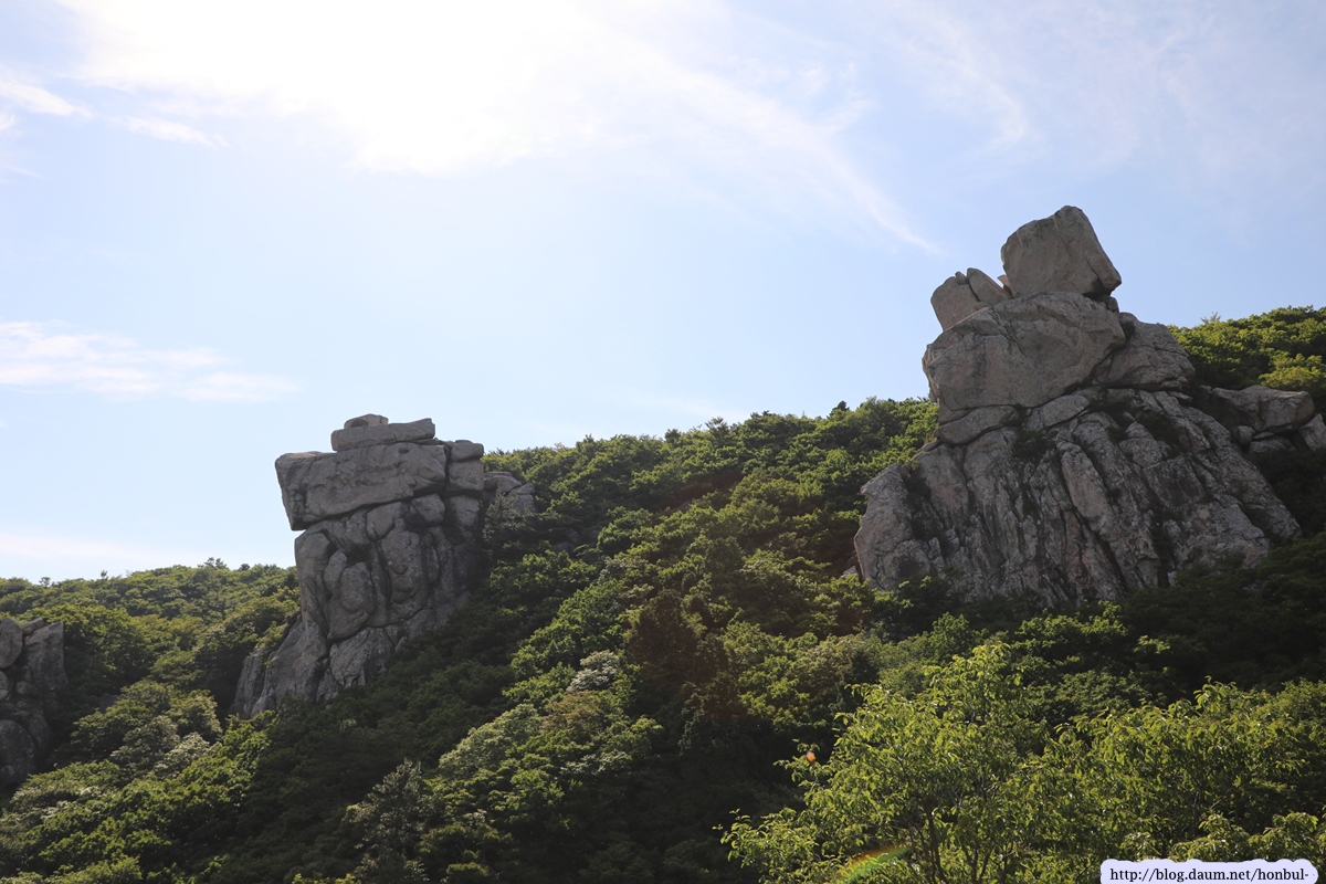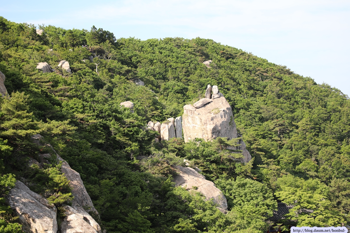 현 위치에서탐방로를 따라 5분 정도 내려가면 갑자기 탁 트이는 시야에 요새처럼 거대한 돌산이 우뚝 솟아 있다.