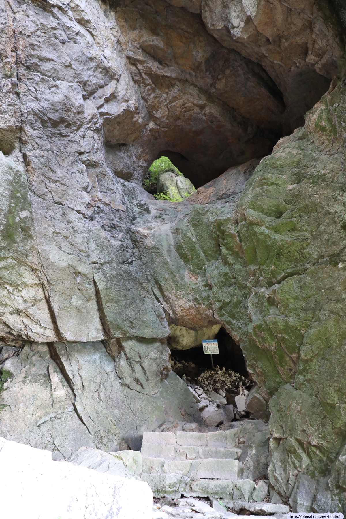 보리암 쌍홍문을 만나기 위해선 안내판이 옆 굴로 내려가야 한다.
