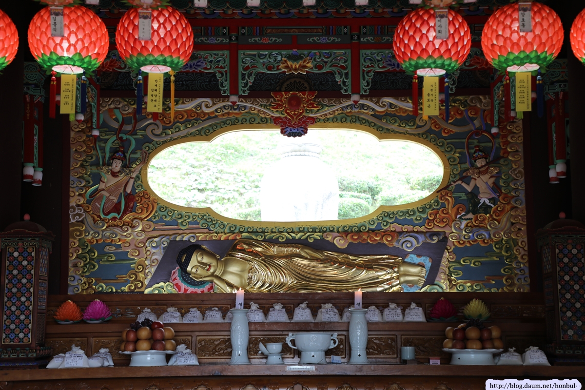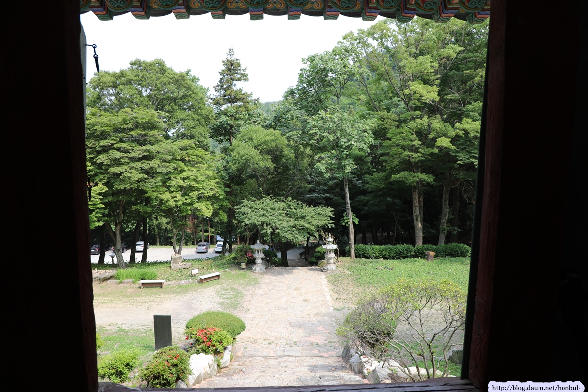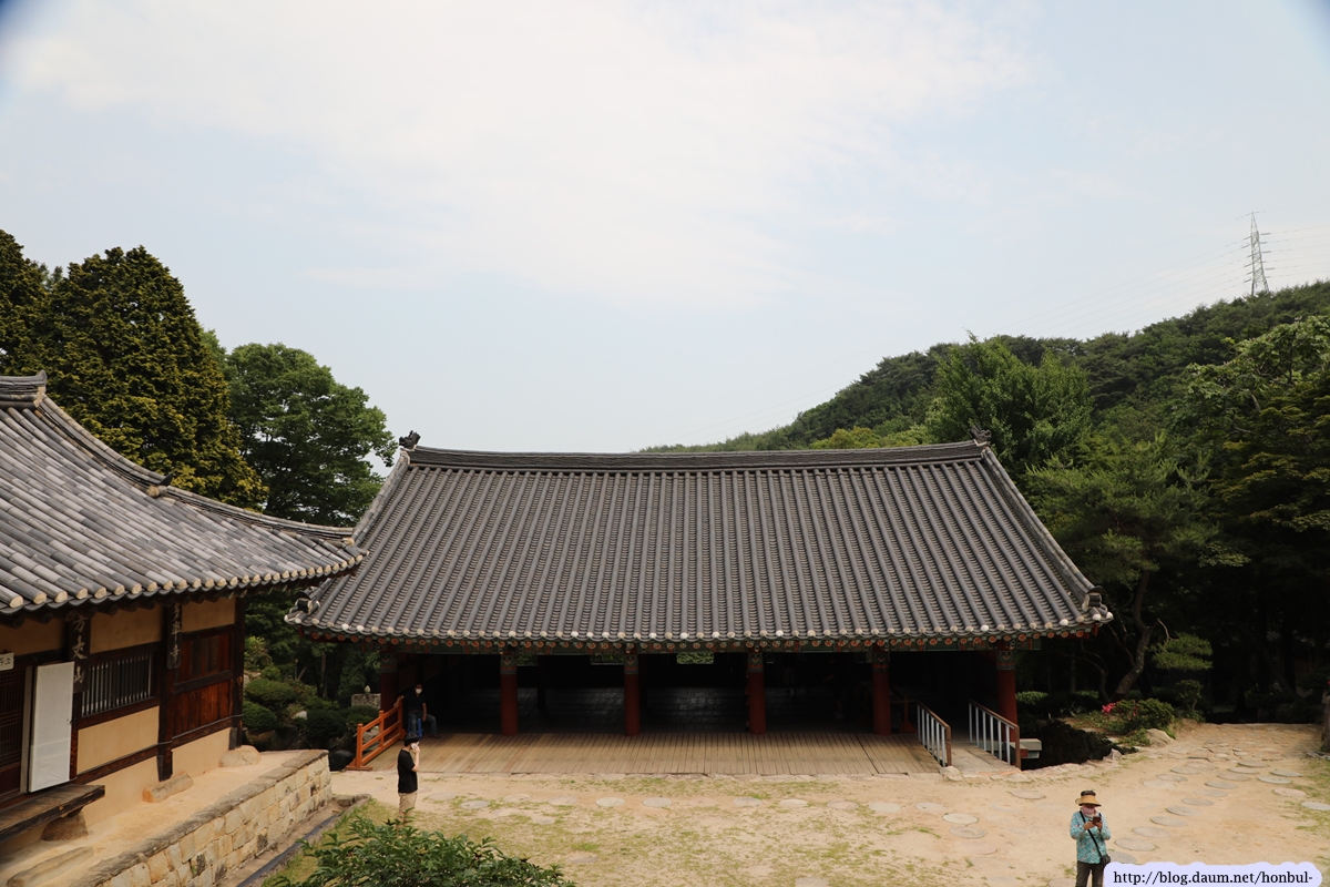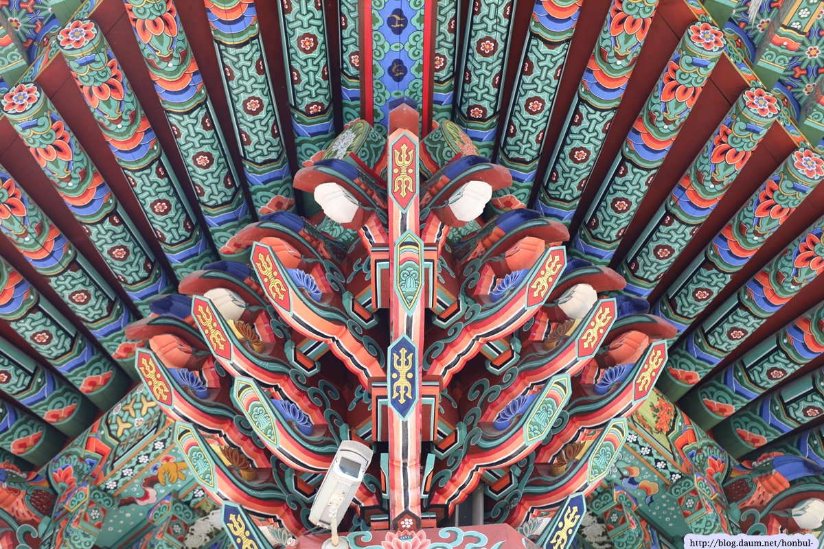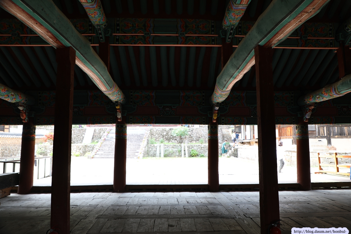 건물 안에는 마루바닥을 깔고 천장은 네모진 틀안에 판재를 깨우고 화려한 꽃 모양의 무늬를 새겼다.