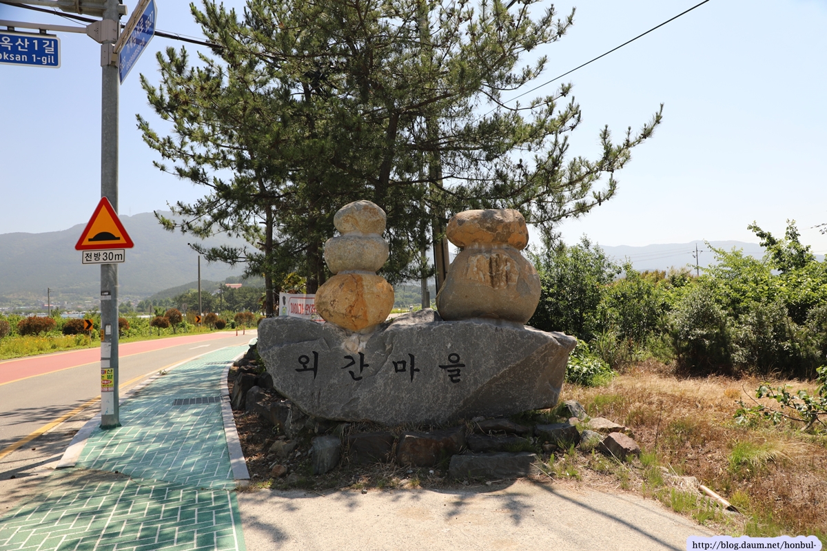 평범한 풍경이 계속되더니 외간마을 입구에 동백나무 보호수 안내 이정표가 보인다.