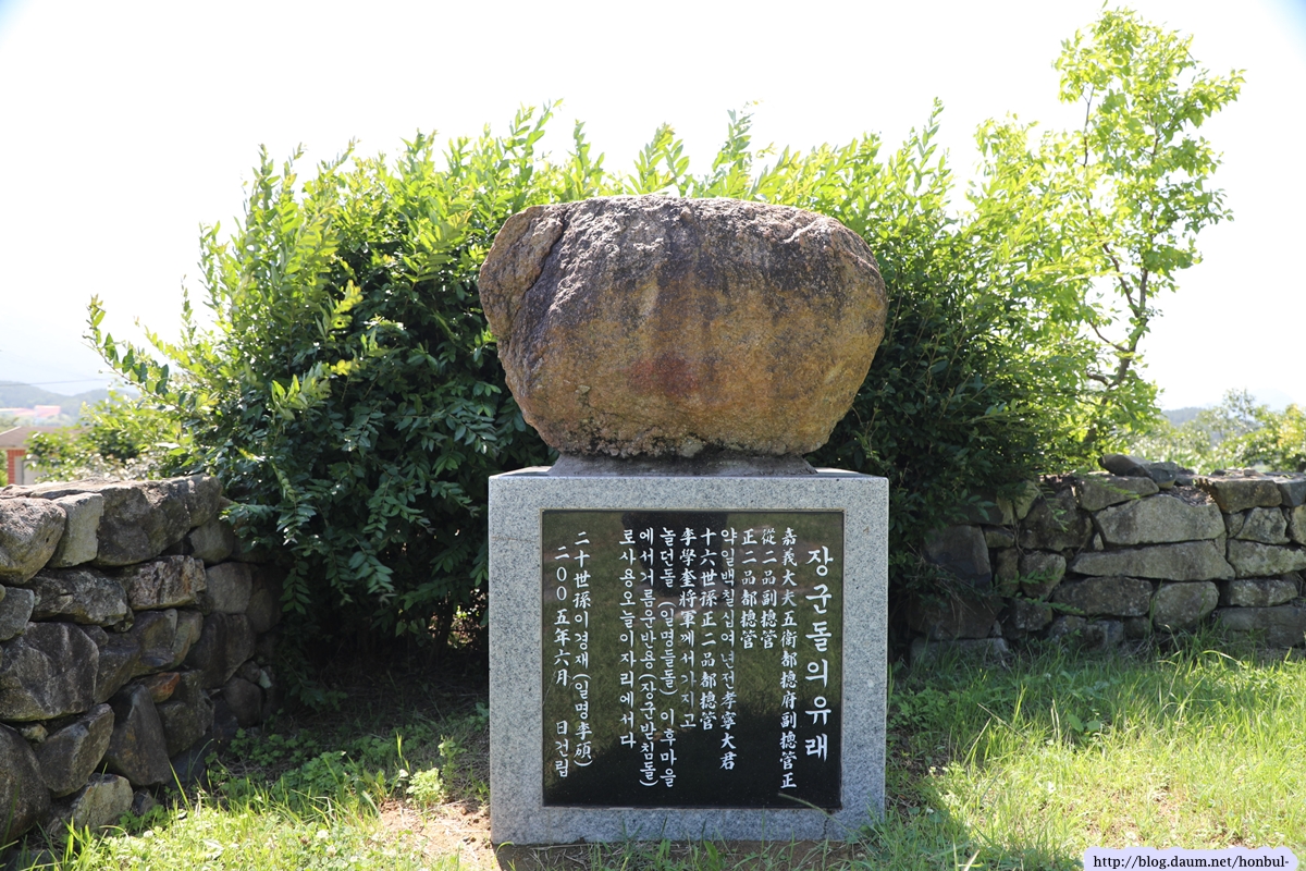 이후 마을에서 거름 운반용(장군 받침돌)으로 사용하던 것을 이 자리에 세운다. (안내문)