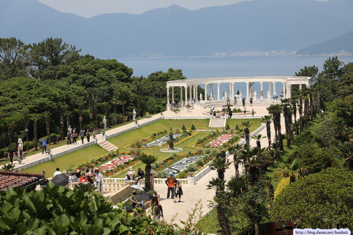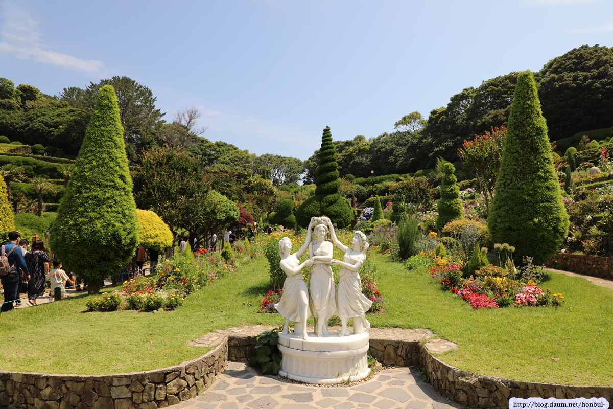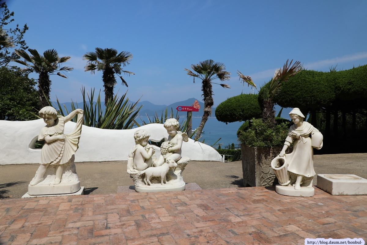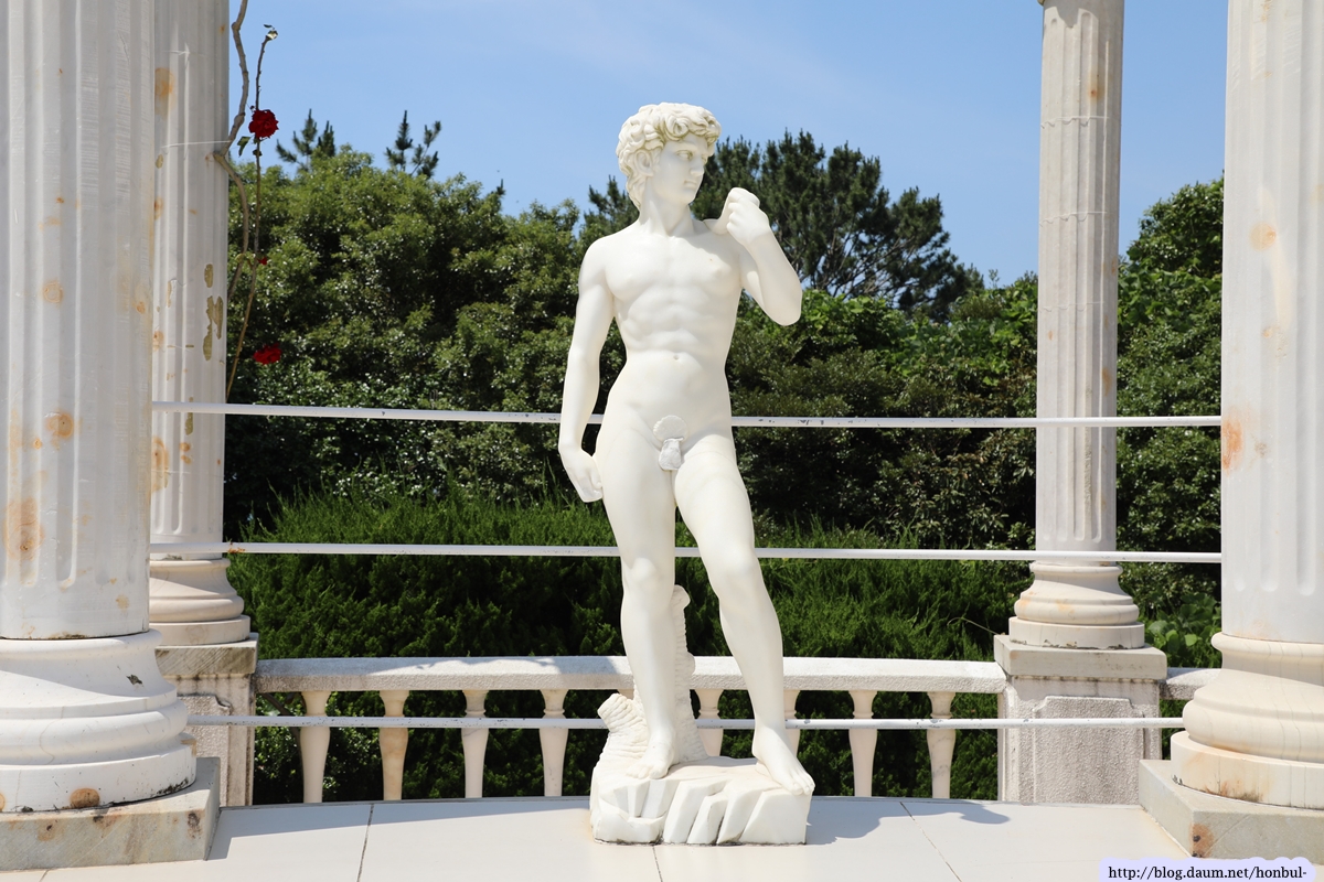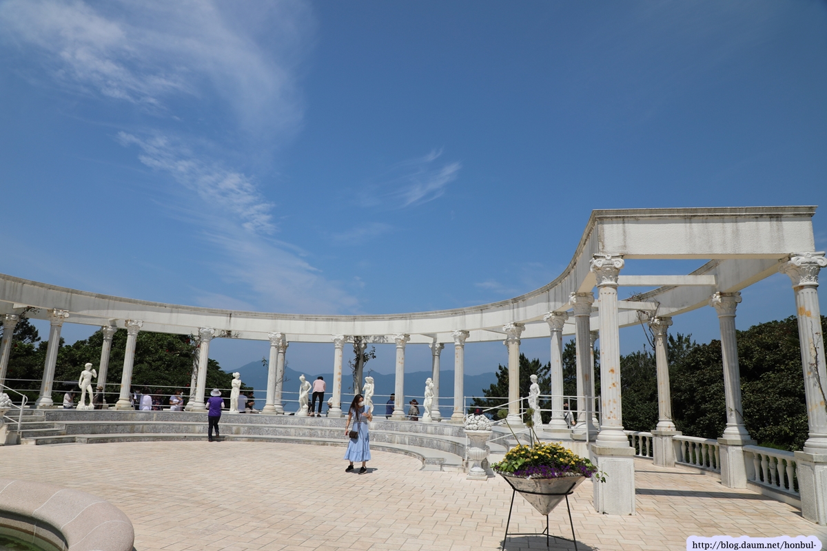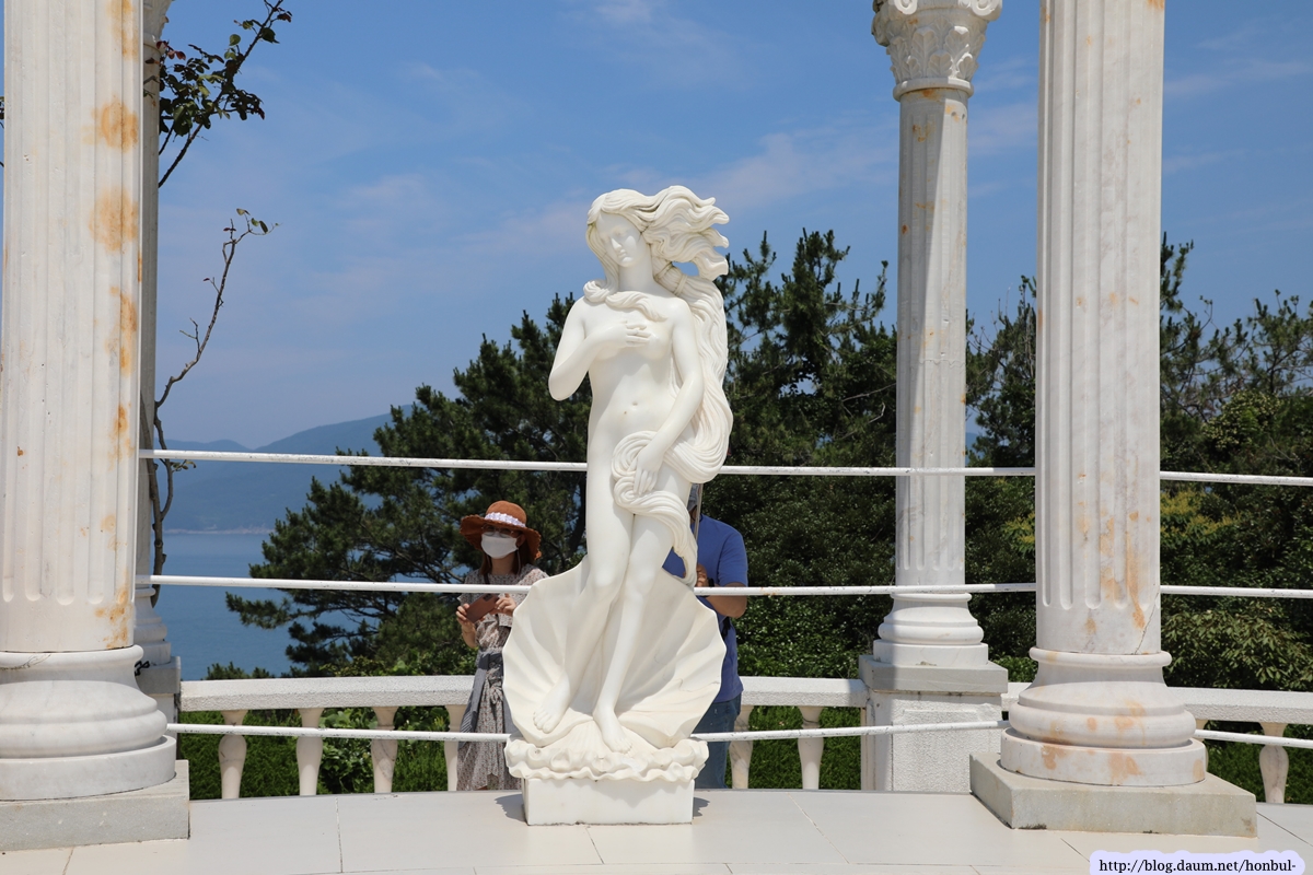 지중해를 연상케 하는 건축물들과 곳곳에 놓인 비너스 상들. 그리고 동백나무 프레임 등이 잘 어우러져 있다.