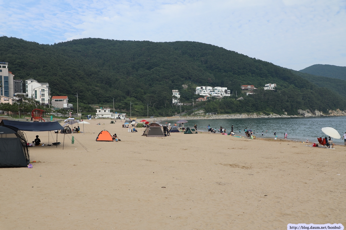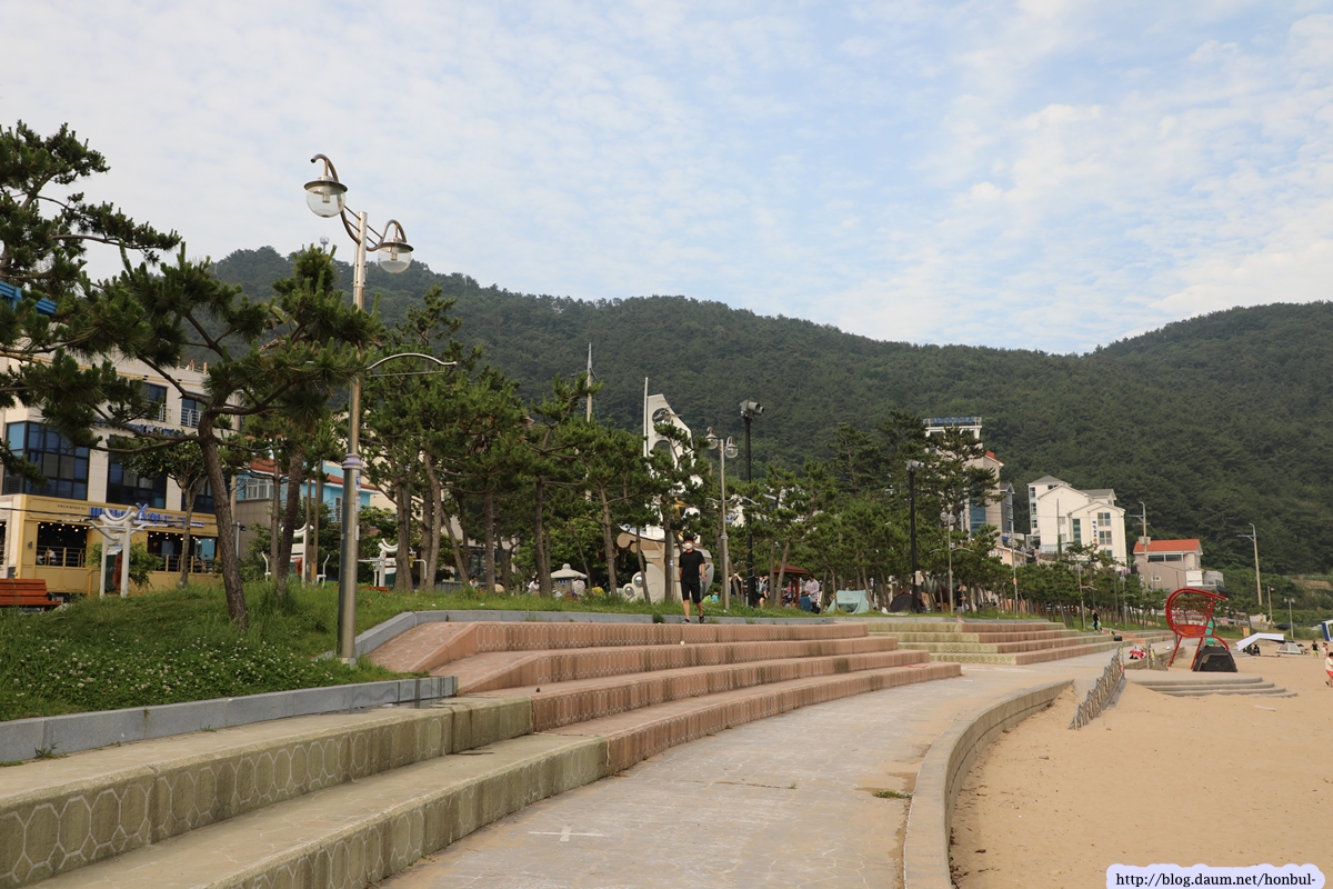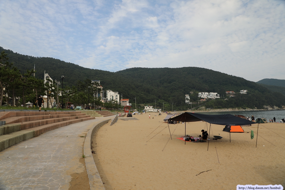 2003년 태풍 ‘매미’에 의해 폐허가 되었으나 완벽한 복구로 현재의 해수욕장이 조성되었다.