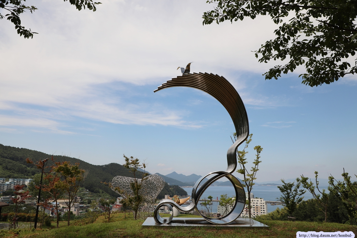 세계화로 나가는 거제시의 더 높은 기상을 파도의 이미지인 곡선들로 표현한 작품으로 거친 파도를 막는 방파제 구조물을