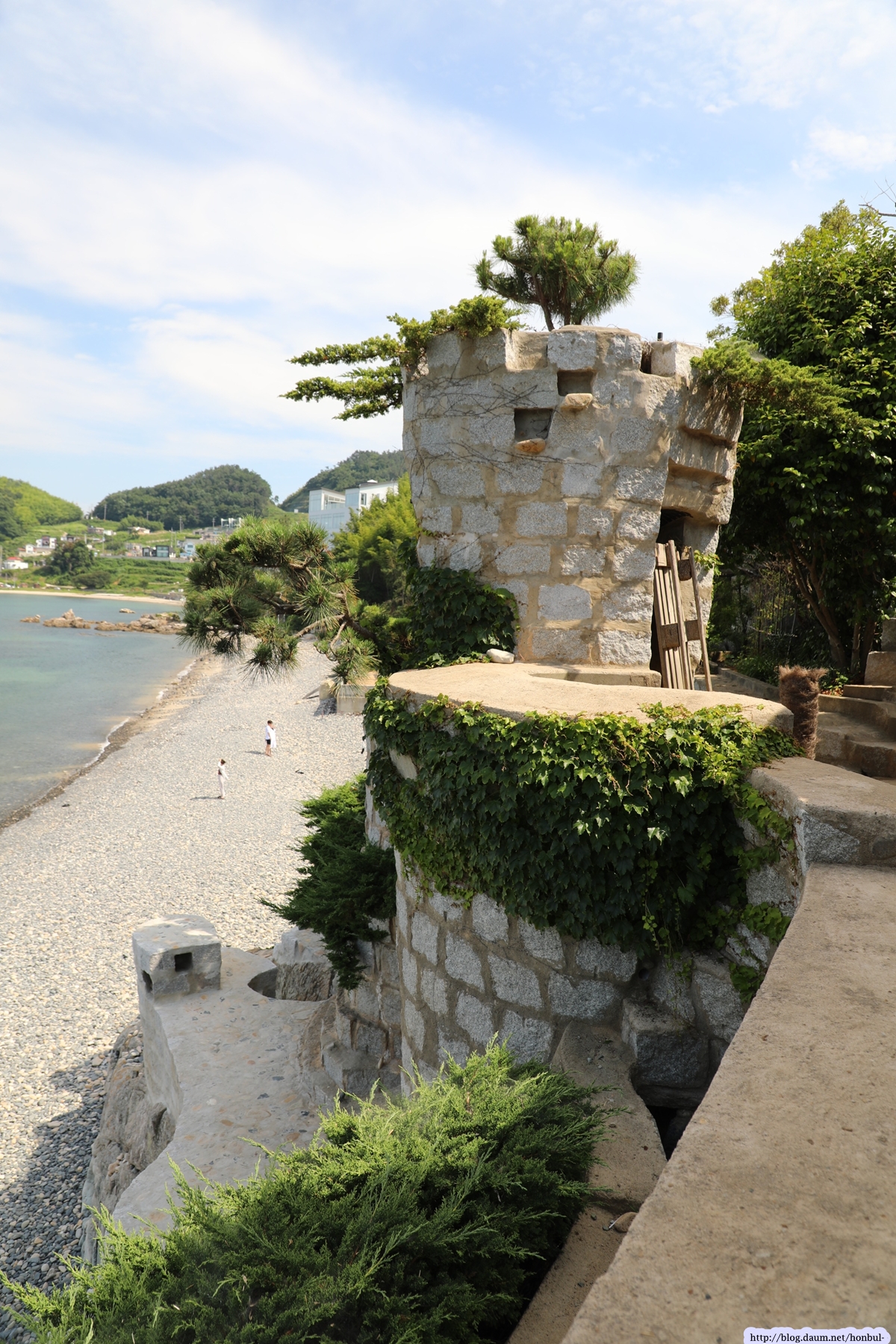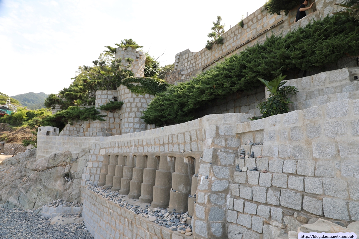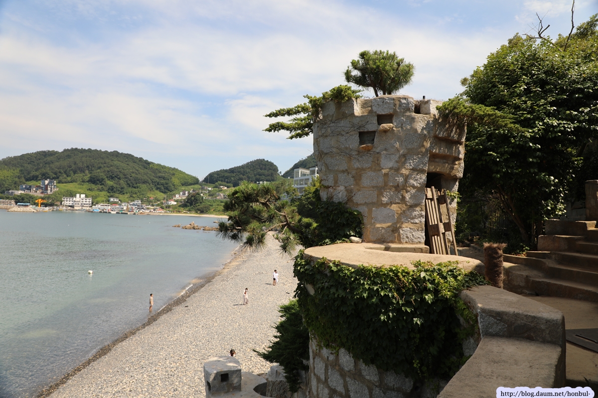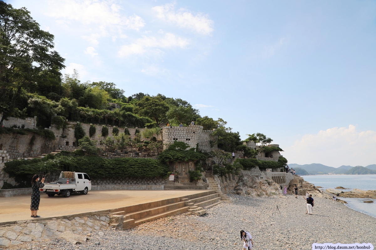 시원한 바다에 깨끗한 몽돌도 멋진 매미성 앞에 있어 더 특별하게 보인다.