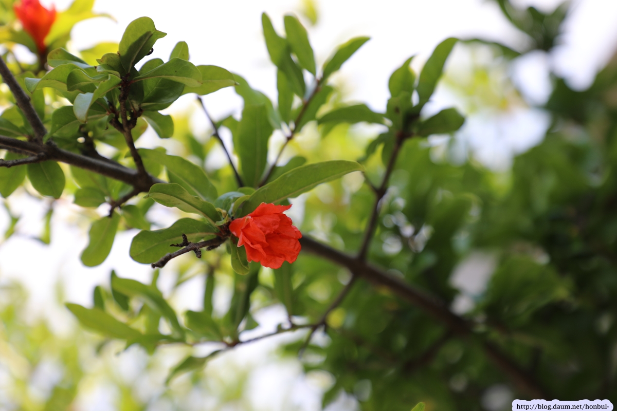 석류나무 꽃처럼 보이는 데, 석류꽃은 시기적으로 좀 늦으니 아니겠다.