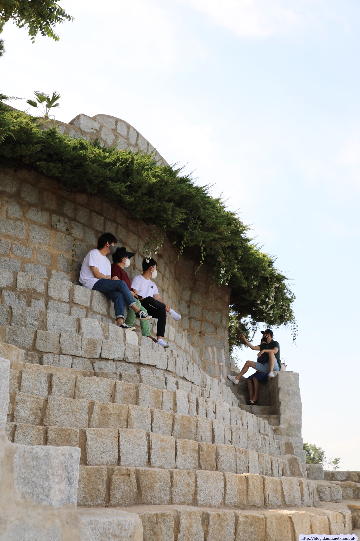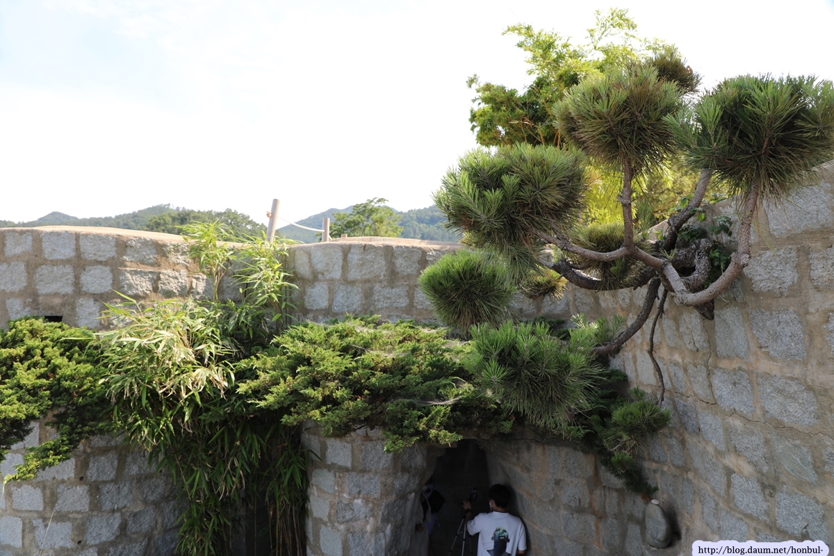 성벽을 빙 둘러 향나무가 밖으로 나오게 만드는 건 매우 어려운 기술이겠다.