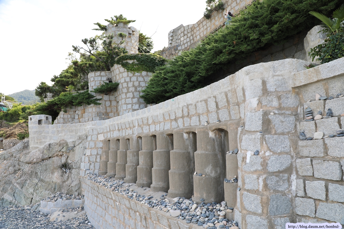 바닷가 근처에 네모반듯한 돌을 쌓고 시멘트로 메우길 반복한 것이