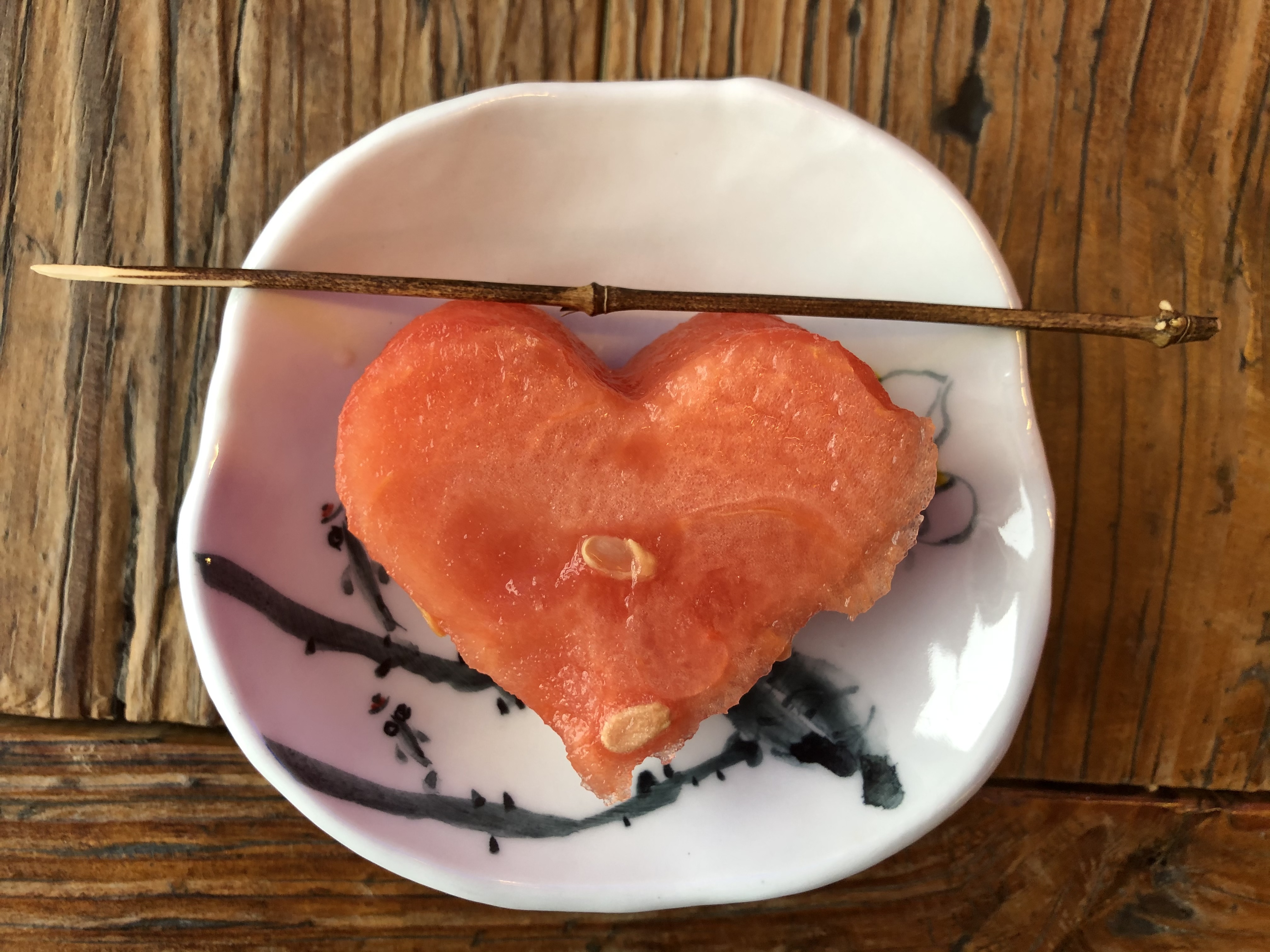 먼저 과일로 수박을 내어왔는 데, 하트 모양으로 예쁘게 만들어 먹기 아까울 정도다.