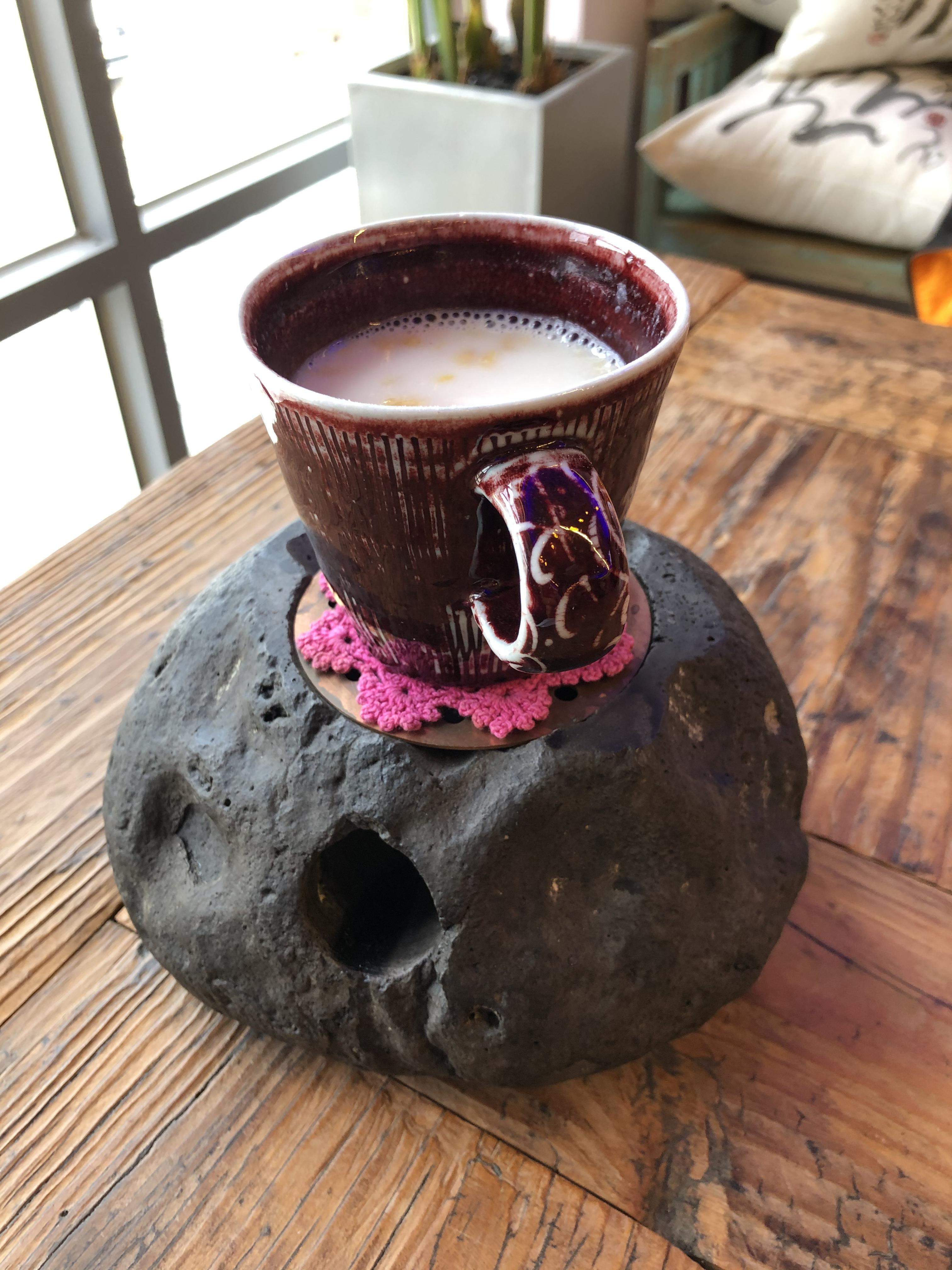 이 검은색 돌 안에 있는 초에 불을 붙이면 차를 따듯하게 유지할 수 있다.