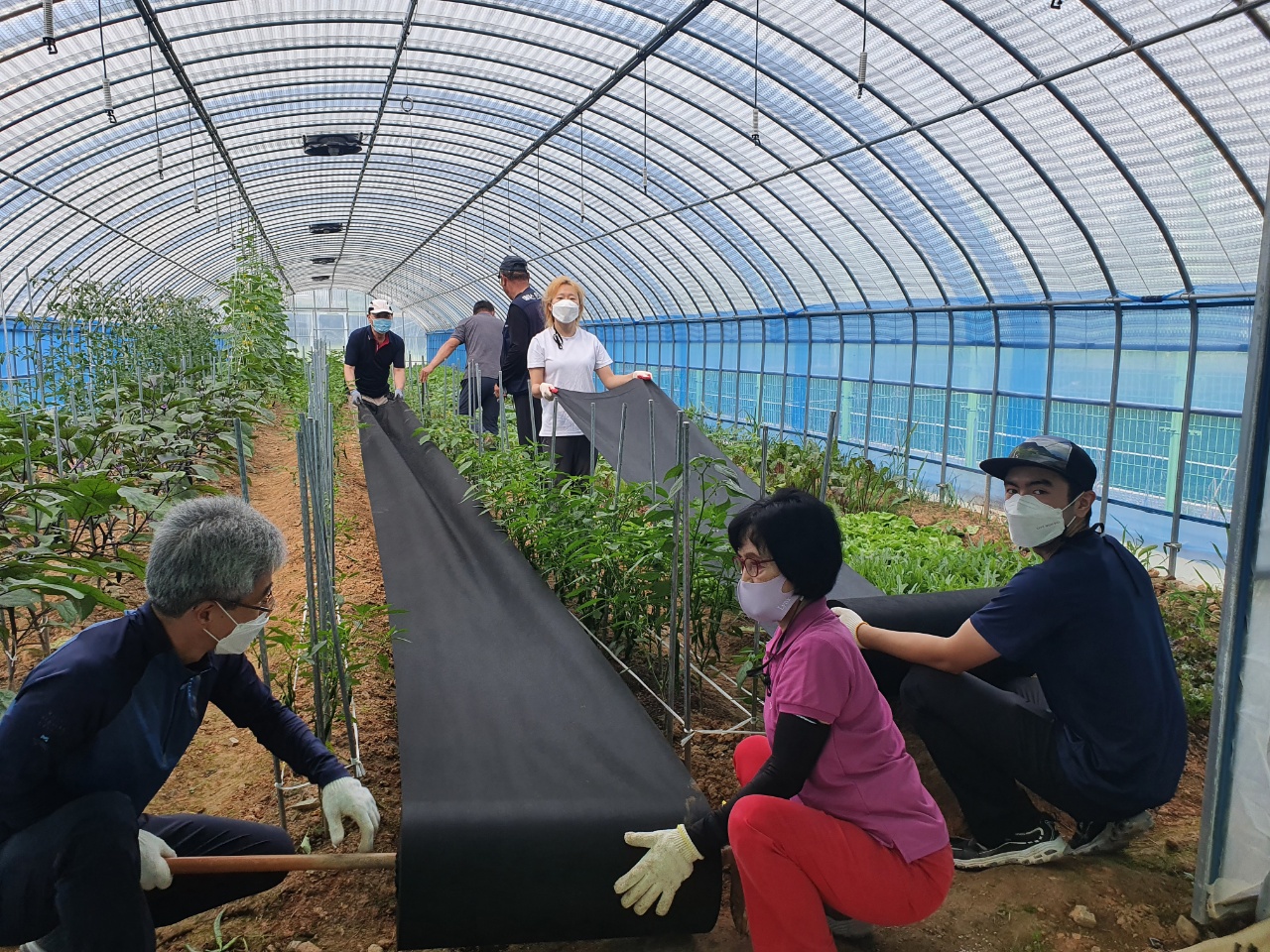 잡초 제거로 시간을 다 보낼 수 없어 고랑에 멀칭비닐을 깔았다.