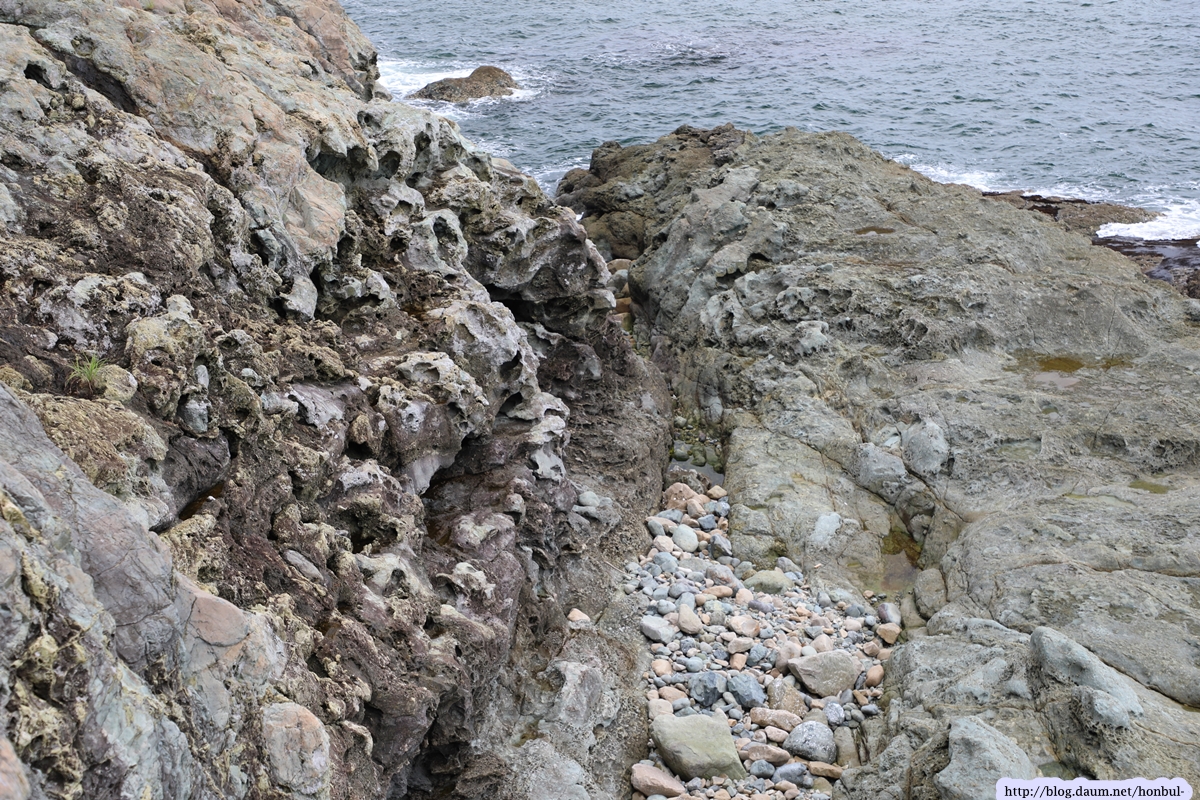 해변은 높은 돌산을 오르지 않고도 파도에 드러난 바위를 보는 재미가 있다.