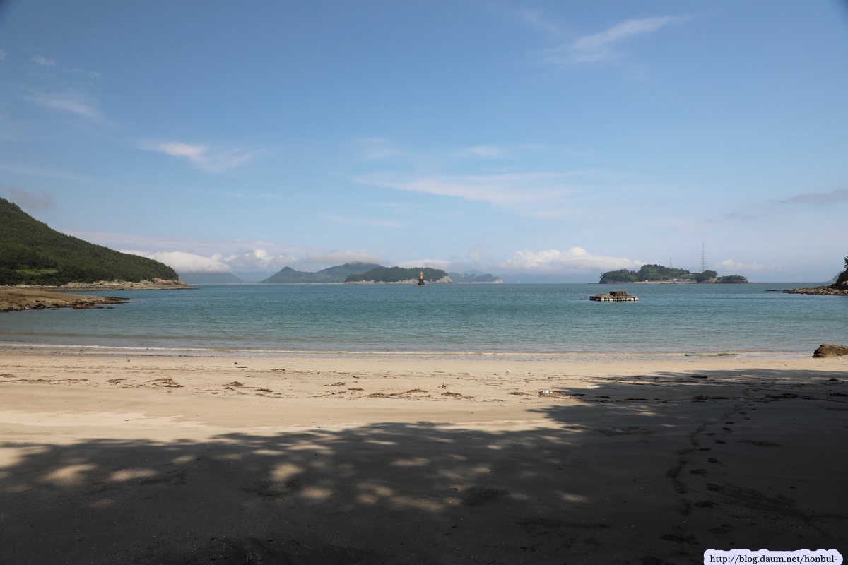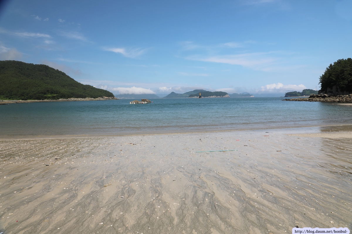남해안인데도 갯벌이 아닌 모래사장이라 물은 푸르고 맑다.