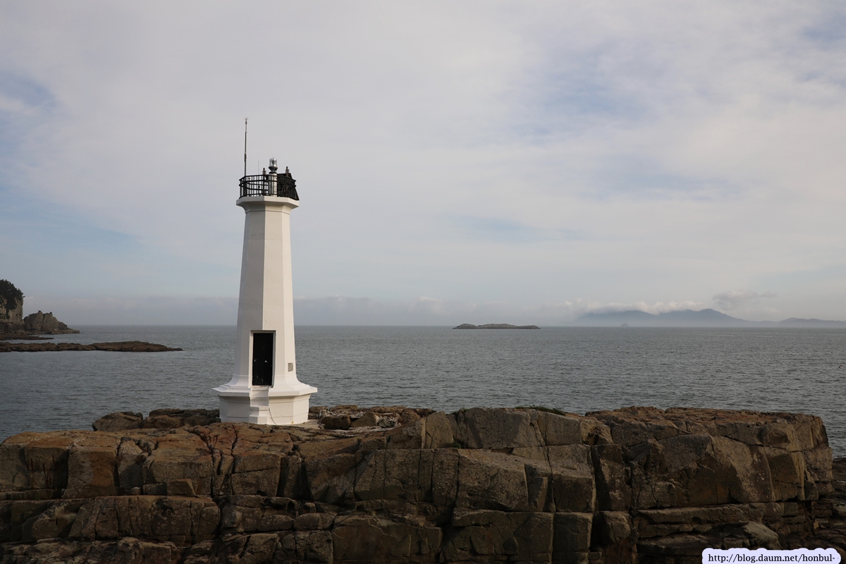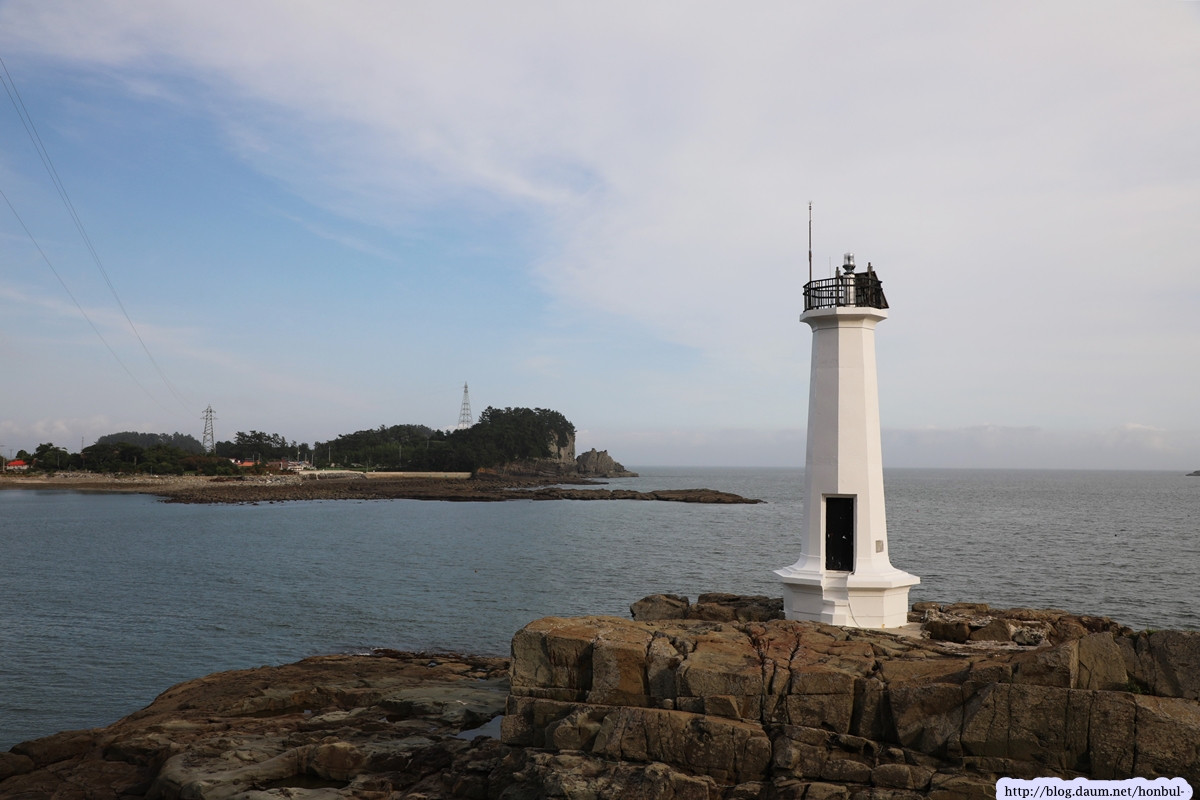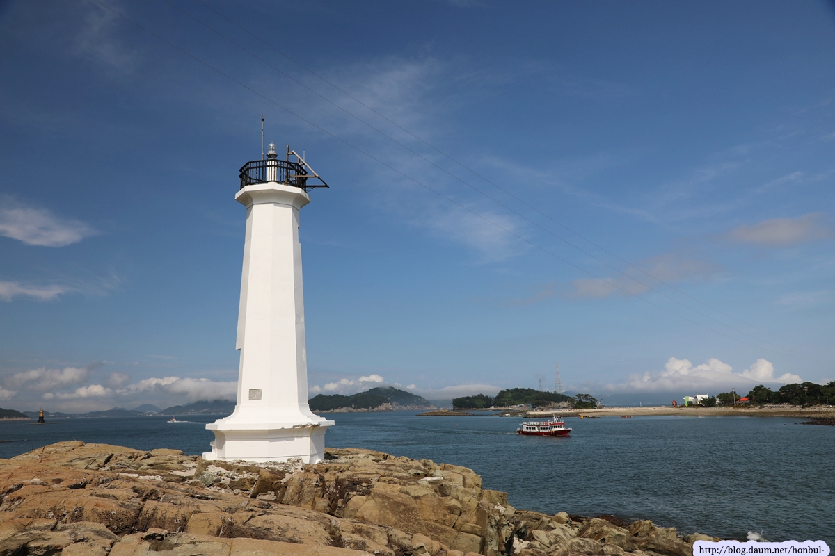 파란 하늘과 푸른 바닷물 사이에 흰색 등대가 잘 어울린다.