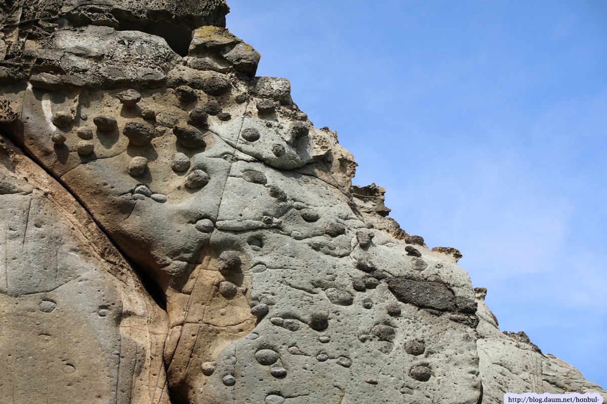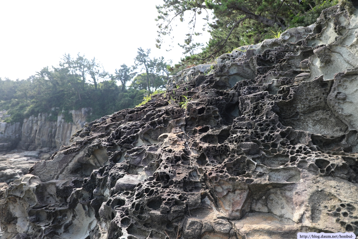 이런 곰보 같은 바위를 딛고 바닷가로 내려선다.