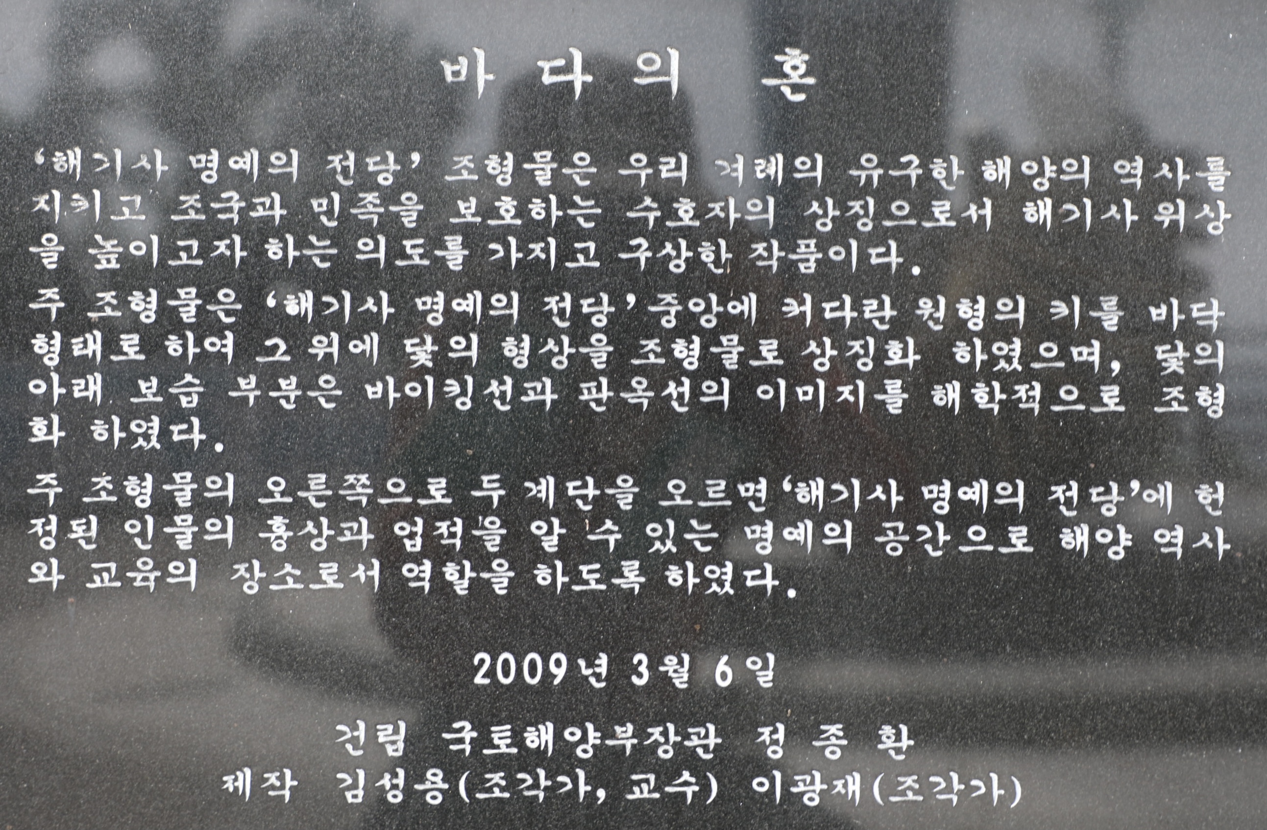 지름 3.2m, 높이 6.9m로 판옥선과 바이킹의 이미지를 담아, 바다로부터 조국과 민족을 수호하는 해기사들의
